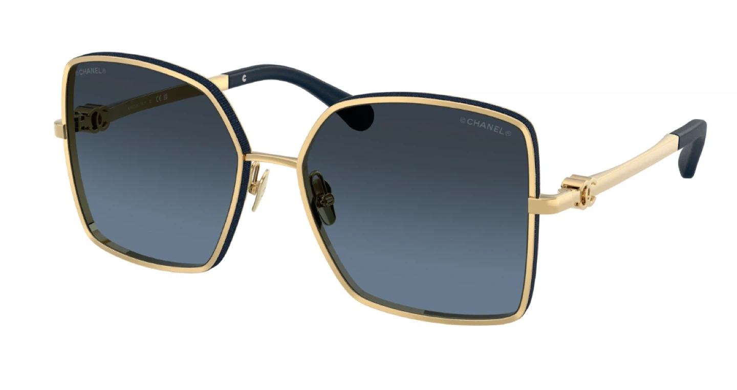 Stylish oversized square sunglasses from CHANEL. Features gold-tone metal frames with navy detailing and blue gradient lenses. Made in Italy. These shades are perfect for adding a touch of luxury to any outfit.