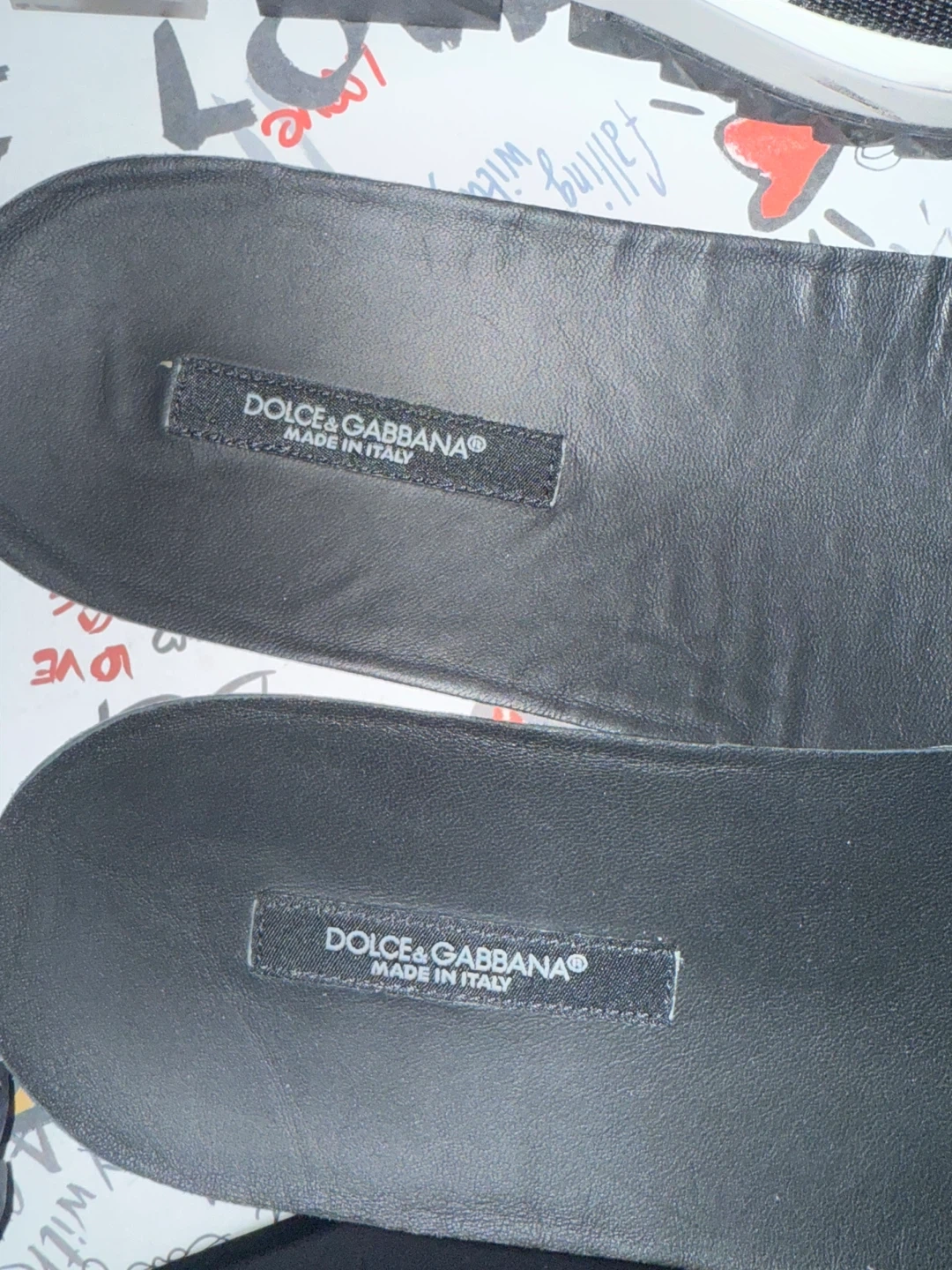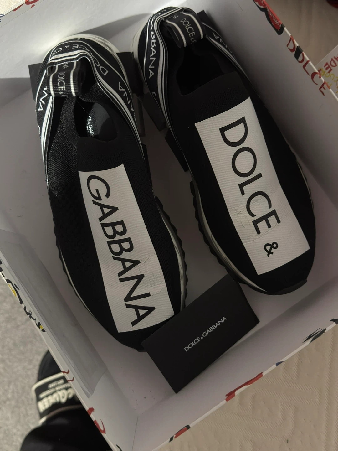 Black knit slip-on sneakers from Dolce & Gabbana. Features a white band with logo detail across the top. Made in Italy. Size 39.
