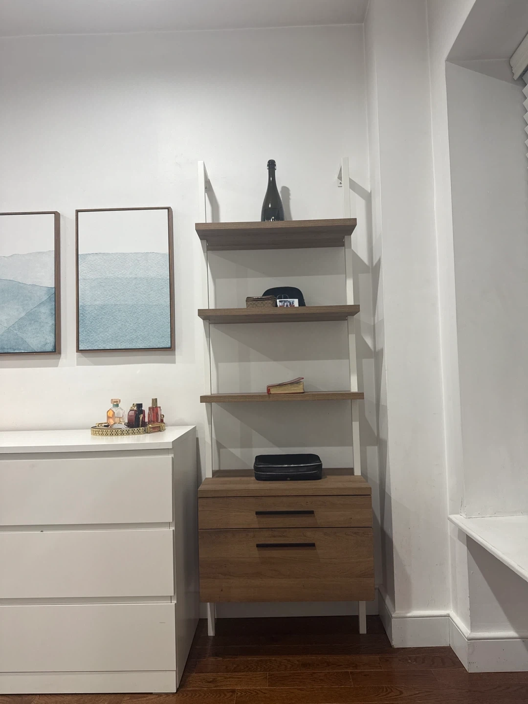 This ladder bookshelf features two open shelves and a two-drawer base. It's constructed with a wood-grain finish on the drawers and a white metal frame. Perfect for storing books and decorative items!