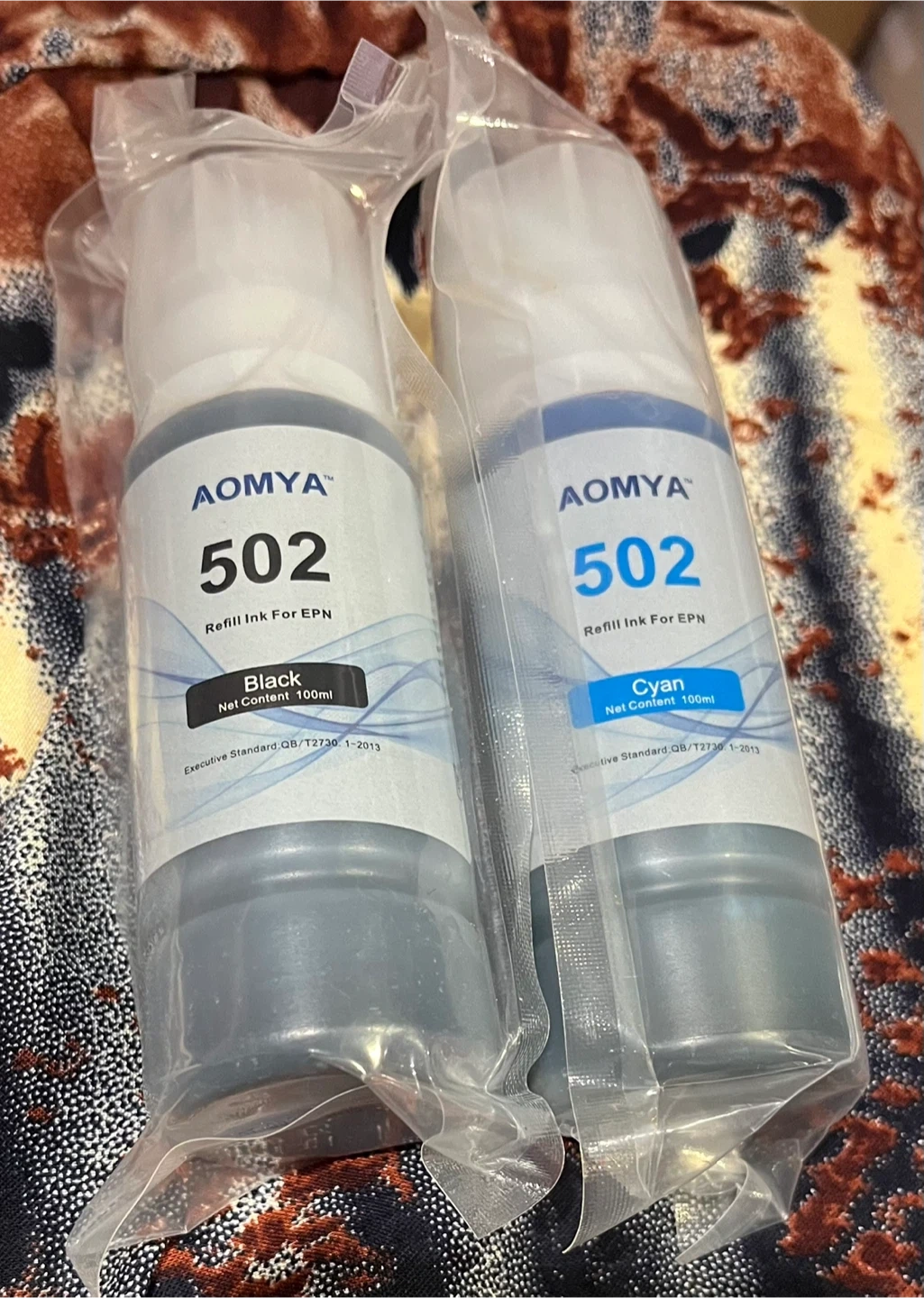 Two bottles of AOMYA 502 refill ink for EPN printers. Includes one black and one cyan bottle. Net content is 100ml per bottle. These are refill inks for printers.