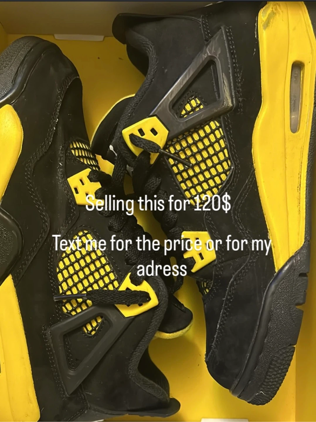 Selling a pair of Air Jordan 4 Retro 'Lightning' sneakers. These feature a black nubuck upper with vibrant yellow accents and the iconic Jumpman logo. The visible Air unit in the heel provides cushioning. It's a popular colourway for collectors!