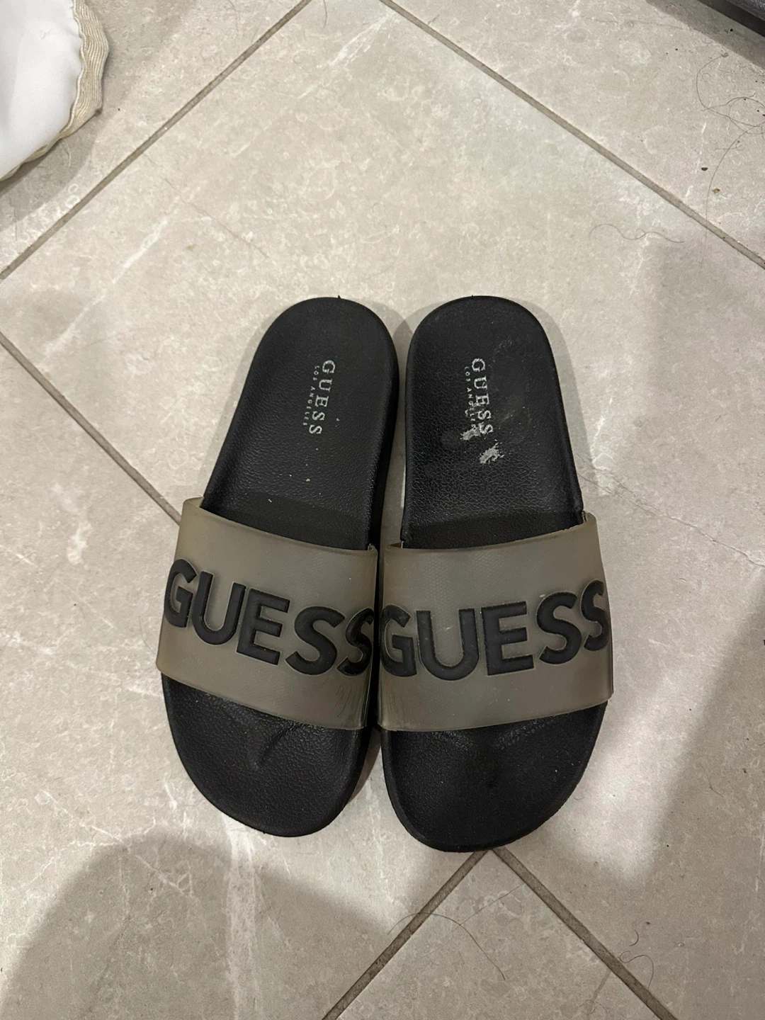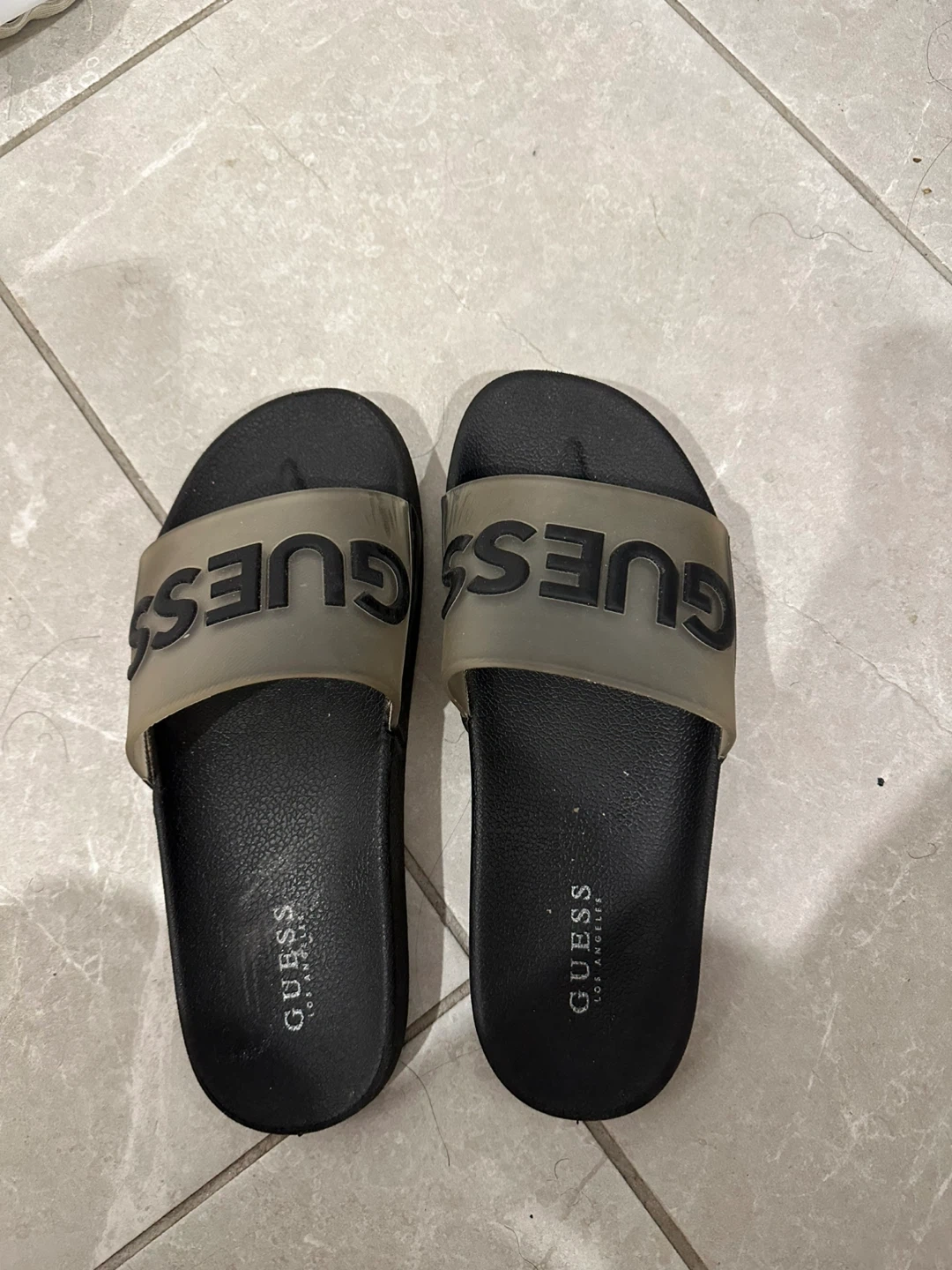 Black GUESS slides with clear straps featuring the GUESS logo. These sandals are comfortable and stylish for casual wear. Rubber sole.