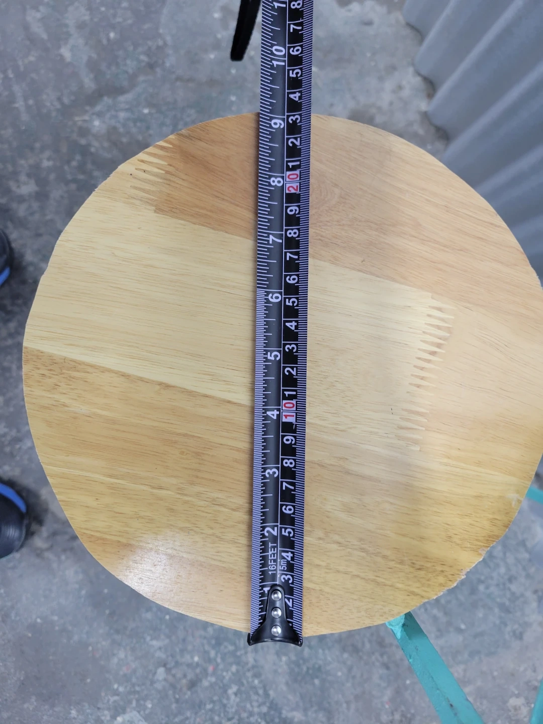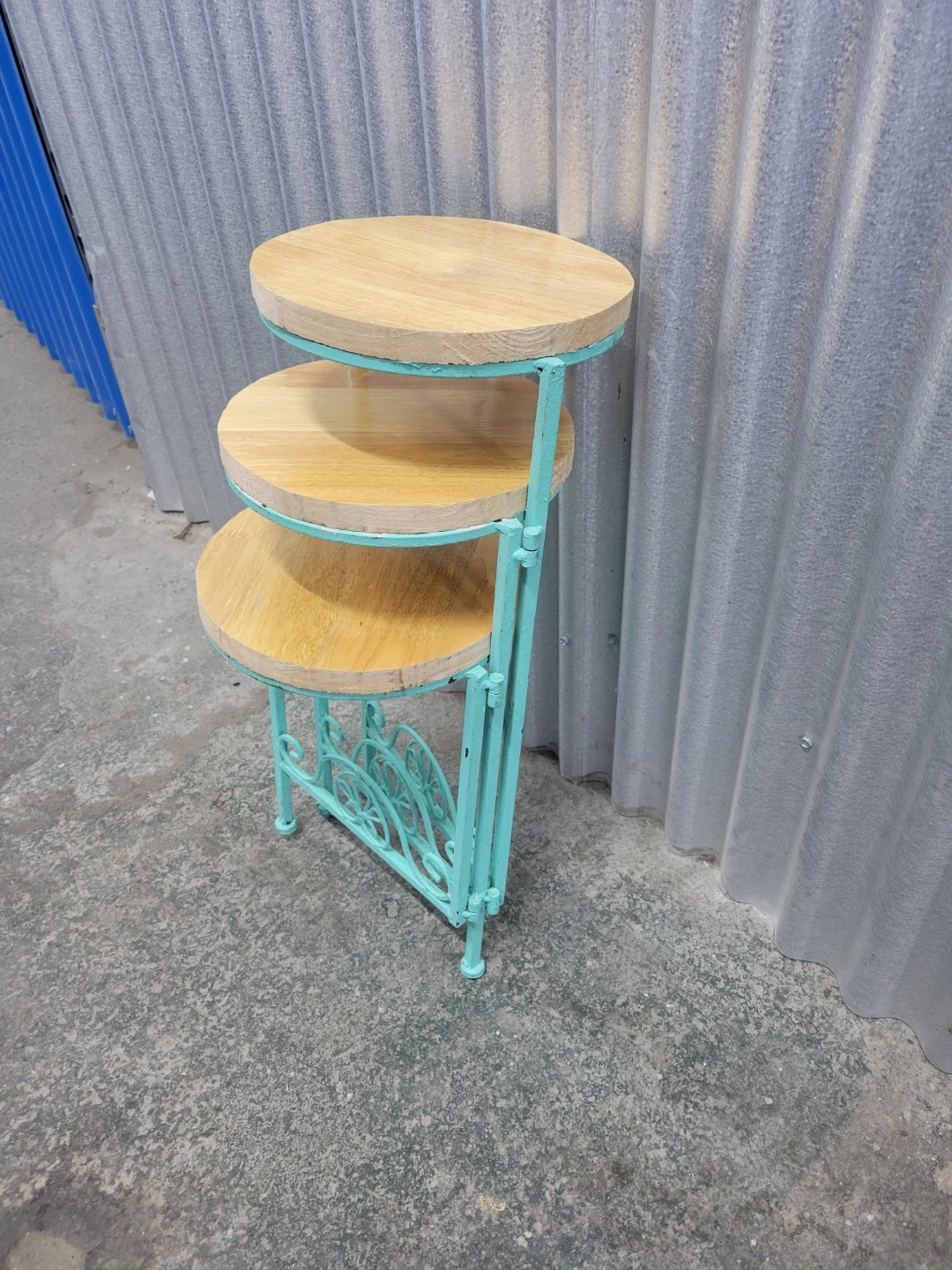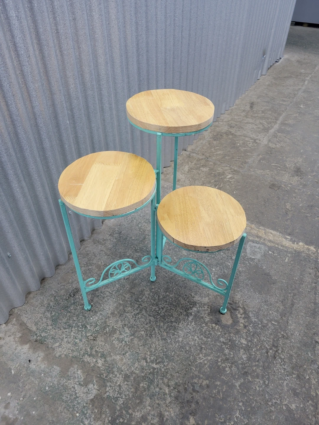 This is a three-tiered plant stand with a turquoise metal frame and wooden top surfaces. The decorative scrollwork on the base adds a charming touch. Measurements for the circular shelf are approximately 9 inches in diameter. Tall is 23". It's perfect for displaying small potted plants indoors or on a patio!