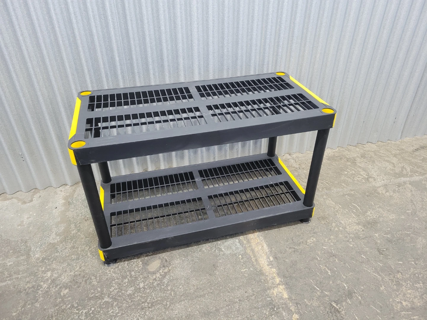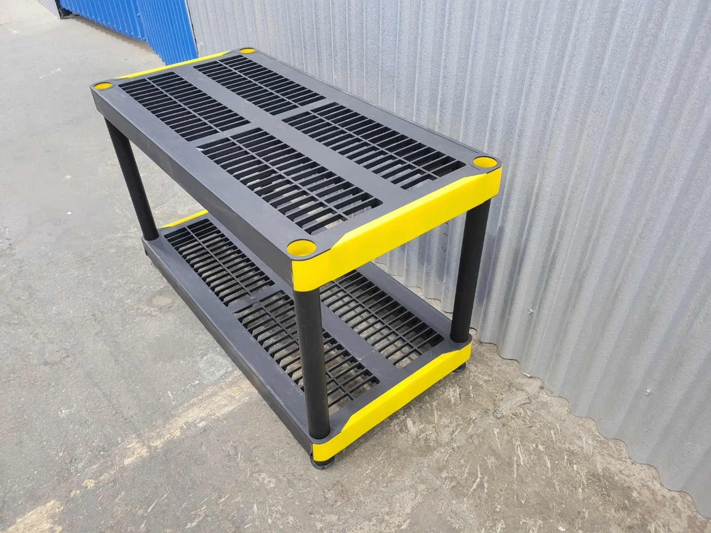 This is a black 2-tier plastic shelf unit. It has yellow corner accents and black posts. The shelves are vented for airflow. It's approximately 36 inches long, 18 inches deep, and 21,5 inches high.