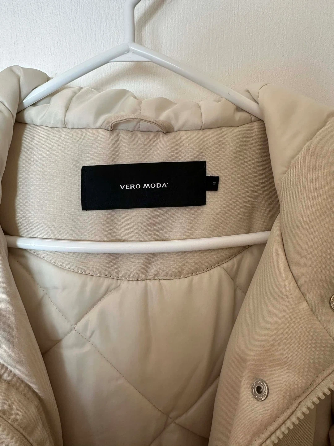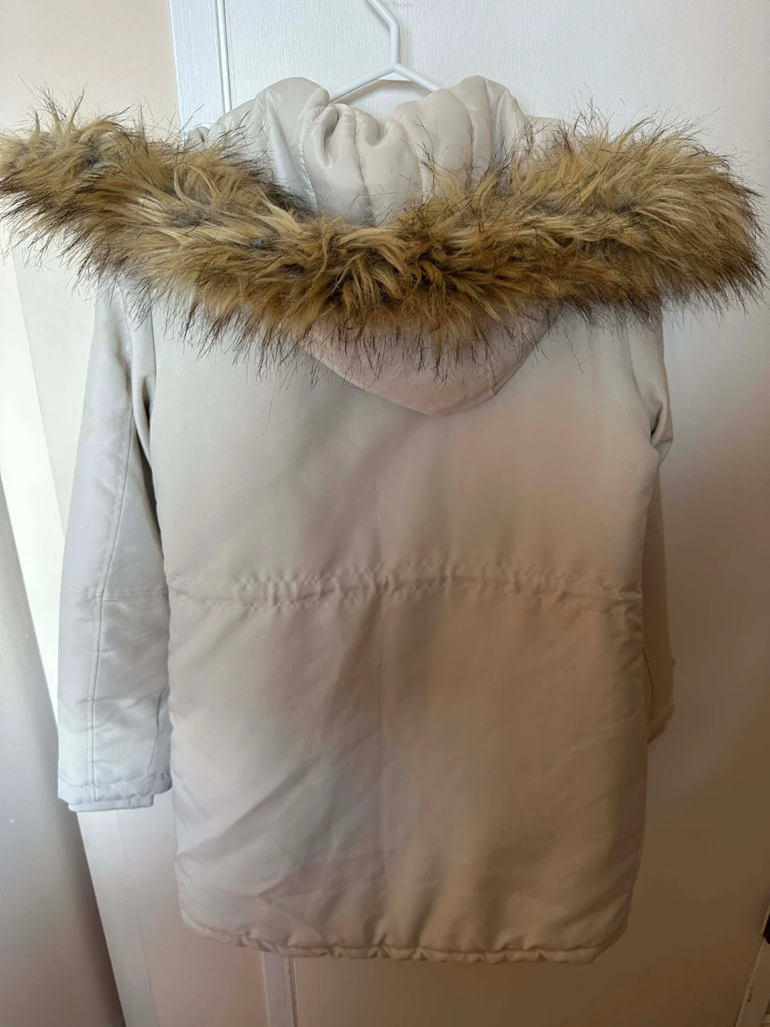 This VERO MODA parka jacket is a size small and comes in a neutral cream colour. It features a cozy faux fur trim on the hood, perfect for cooler weather. It's designed with multiple pockets and a zip-up front with snap closure. Pick up cash only