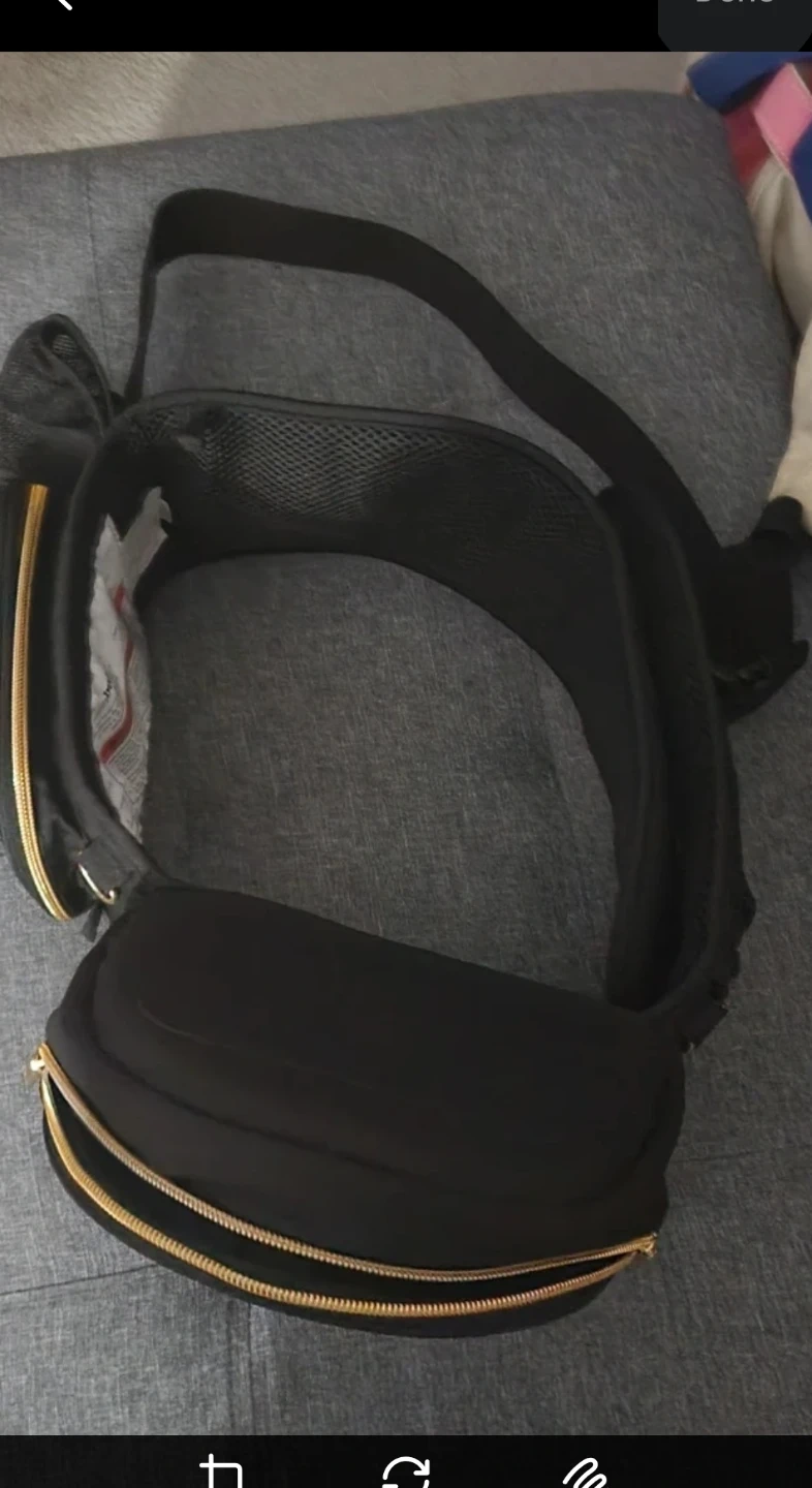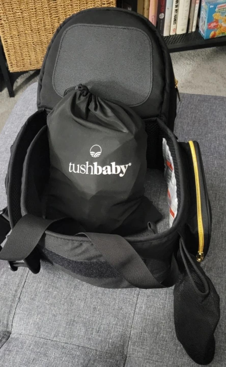This TushBaby hip seat carrier is black with gold zippers. It has multiple pockets for storage. It's designed for comfortable baby carrying.