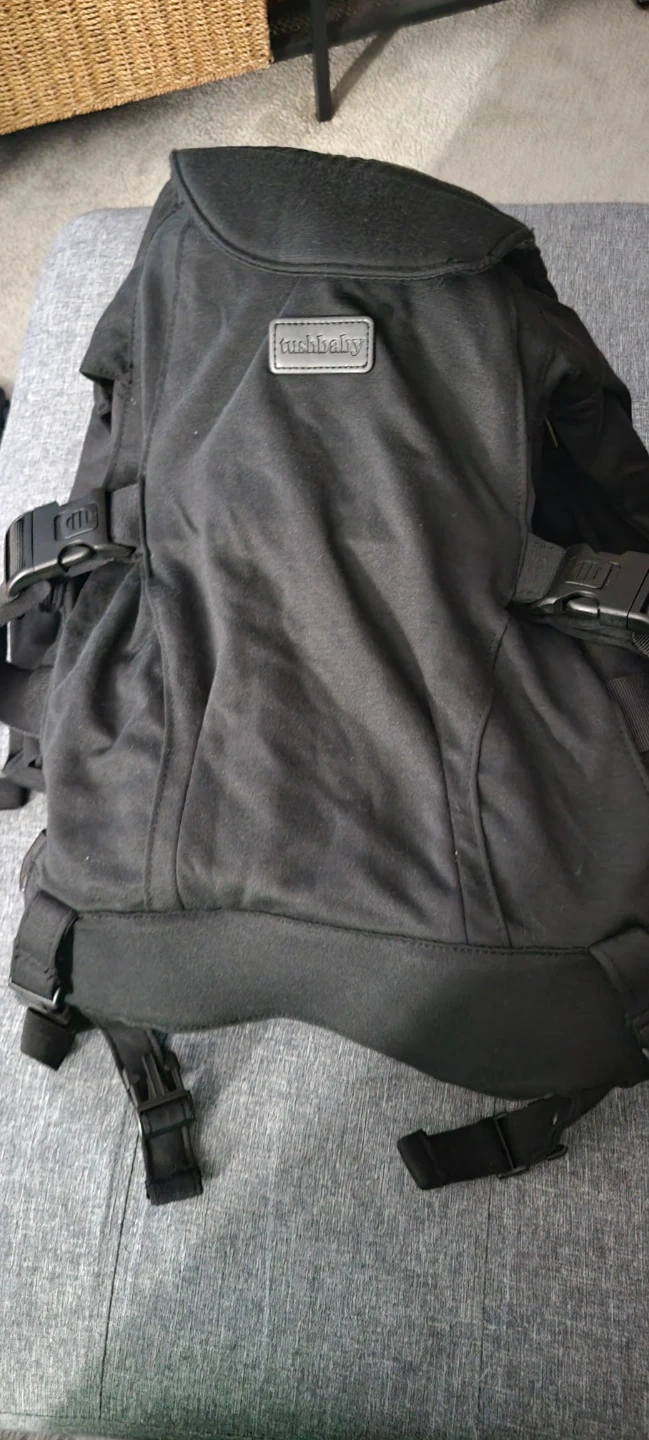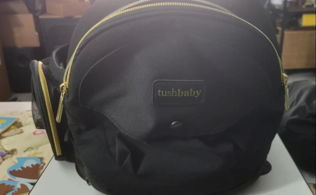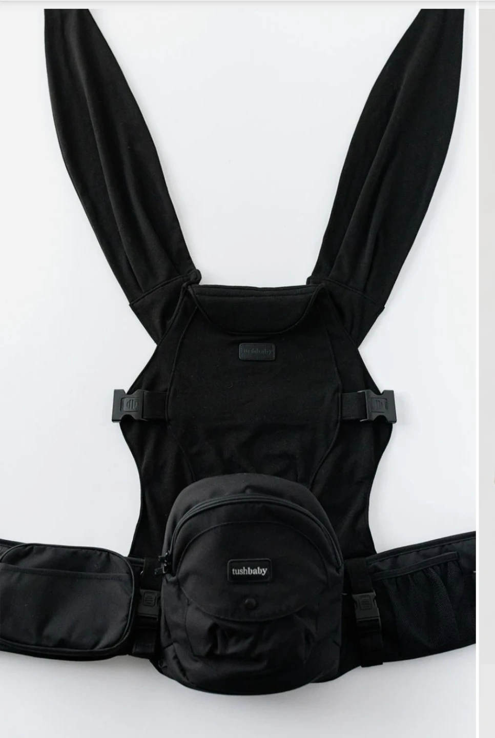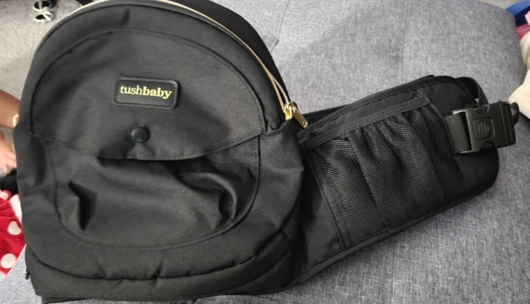 This TushBaby hip seat carrier is black with gold zippers. It has multiple pockets for storage. It's designed for comfortable baby carrying.