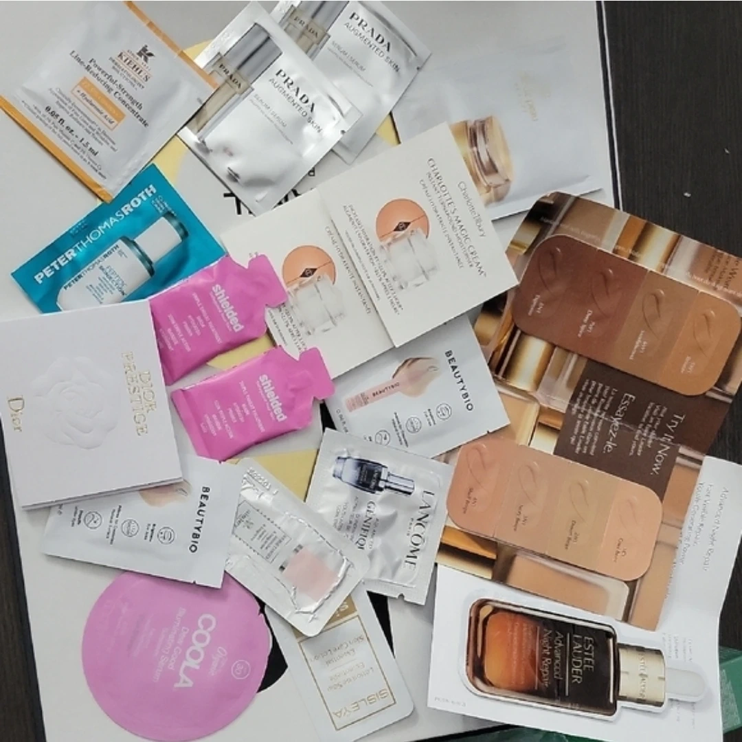 Includes assorted beauty sample sachets or sample cards (see last picture.). Great for travel or trying new products!
