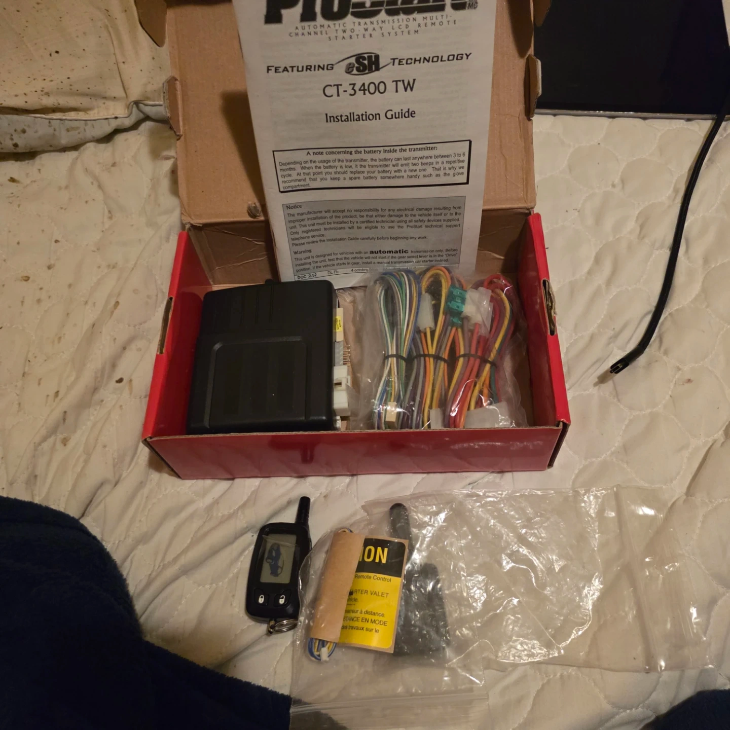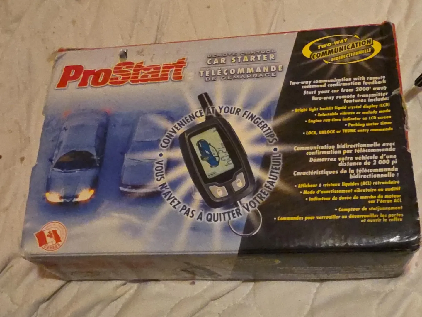 ProStart CT3400 TW automatic transmission remote car starter system. Includes remote transmitter with LCD display, car starter module, and wiring harness. Two-way communication with remote confirmation feedback. Features bright light backlit LCD screen, selectable vibrate or audible mode, engine run-time meter, and parking meter timer. Range up to 2000 ft!