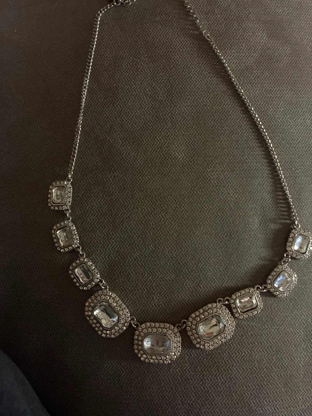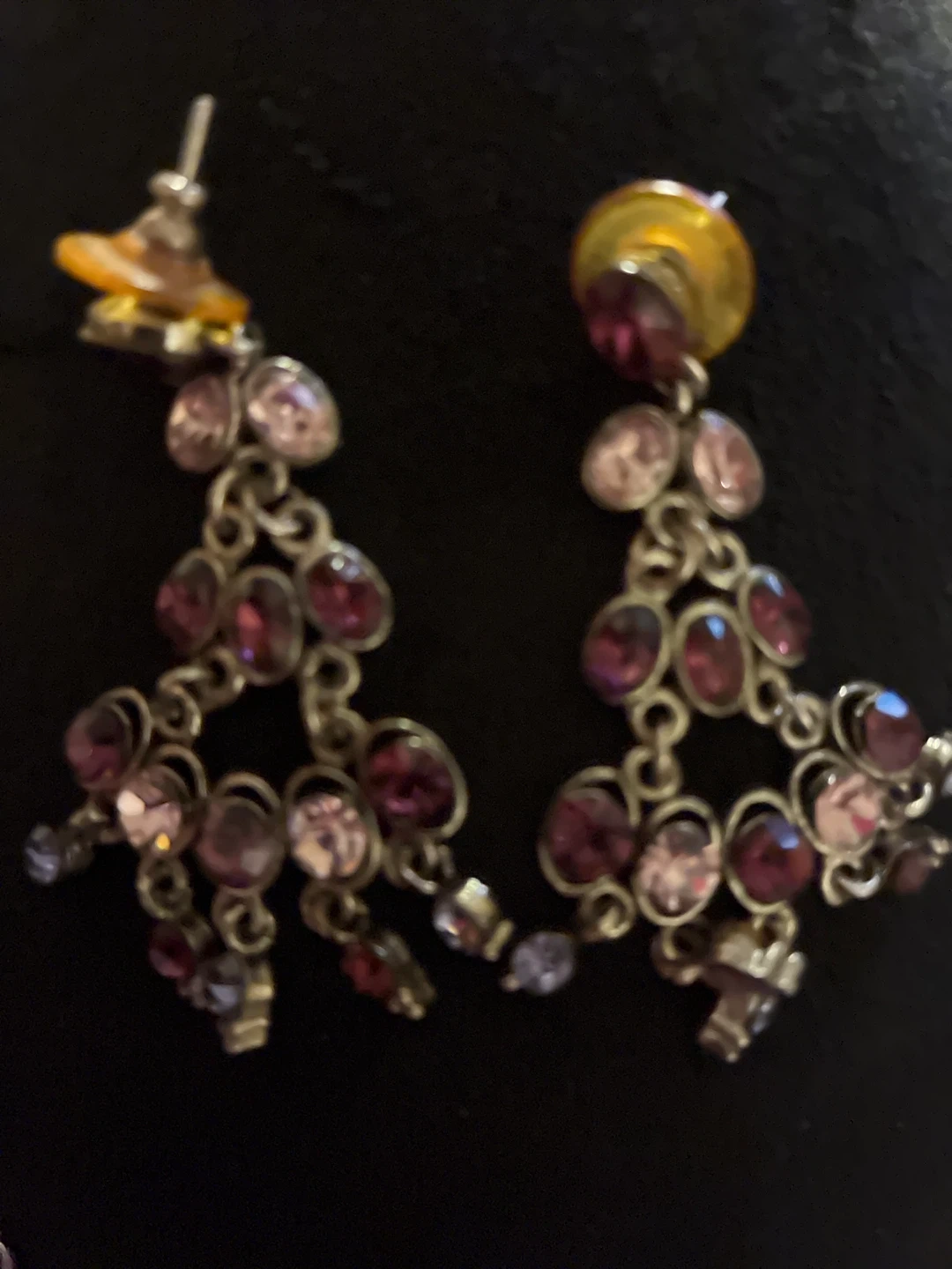 This jewelry set includes a silver-tone necklace with clear rhinestones and a pair of dangle earrings with purple and pink stones. One stone on the necklace needs to be changes but it’s a lovely set for adding some sparkle to your outfit!