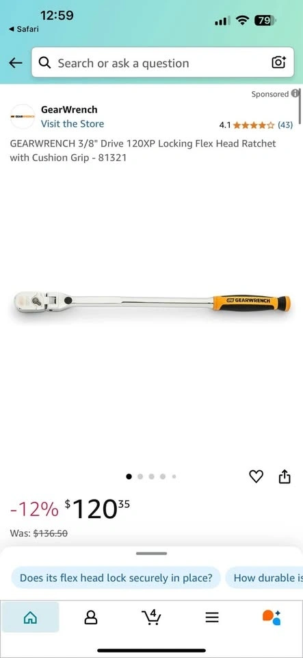 Brand new, never used Gearwrench locking flex head ratchet, 120XP, 3/8" drive. Part # 81321. Pick up near Britannia and Winston Churchill.