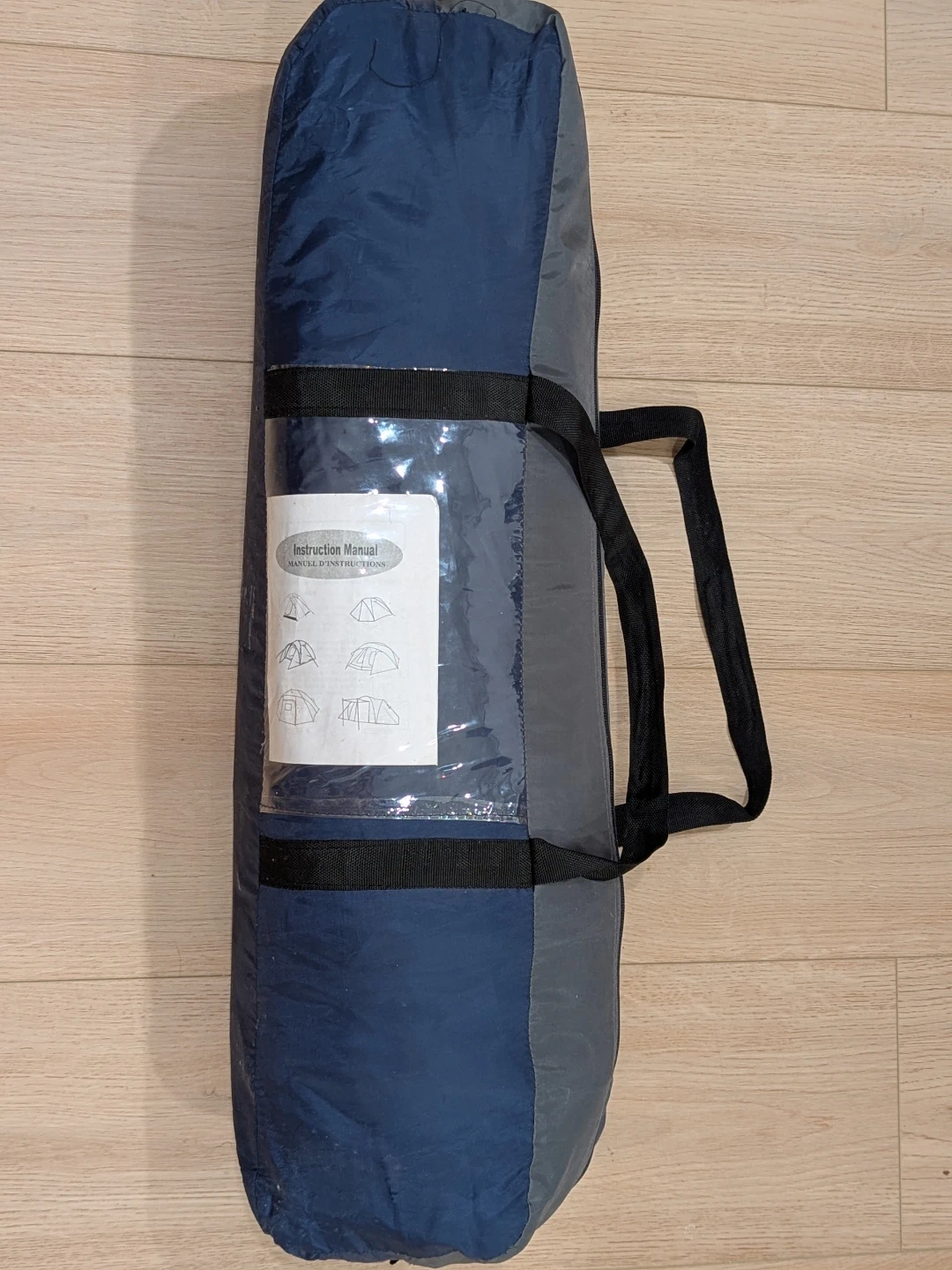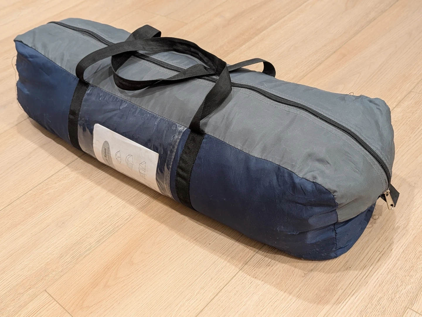 This is a 2-person tent plus carry bag. It's made of durable nylon material in blue and grey. The bag has two handles and a zipper closure. Includes an instruction manual.