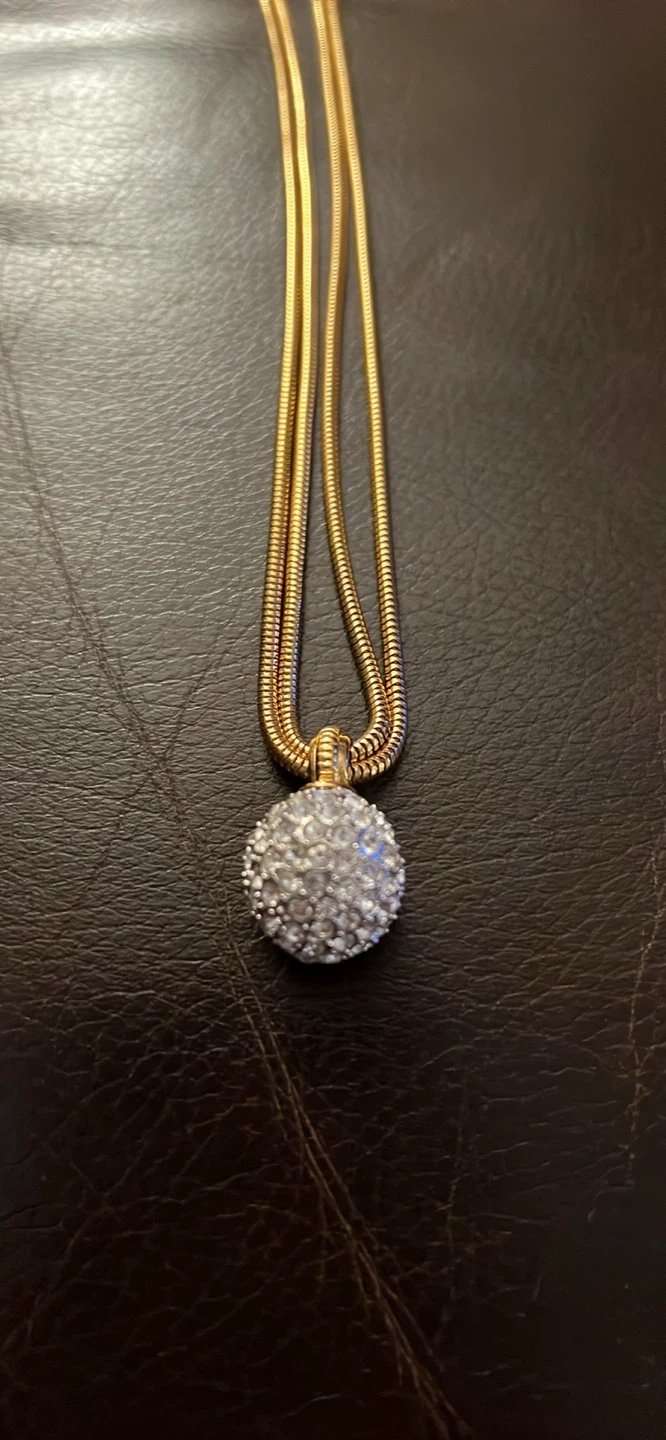 This necklace features a gold-toned chain with a sparkling crystal ball pendant. It's made with quality materials and has a secure clasp closure. Perfect for adding a touch of elegance to any outfit!
