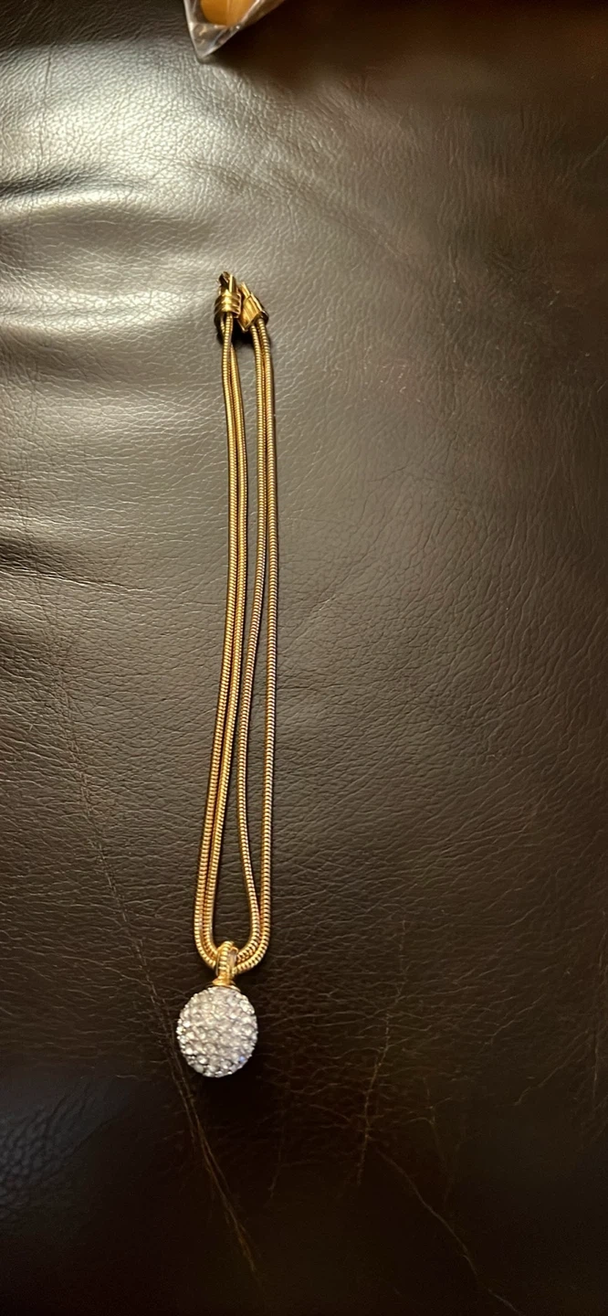 This necklace features a gold-toned chain with a sparkling crystal ball pendant. It's made with quality materials and has a secure clasp closure. Perfect for adding a touch of elegance to any outfit!