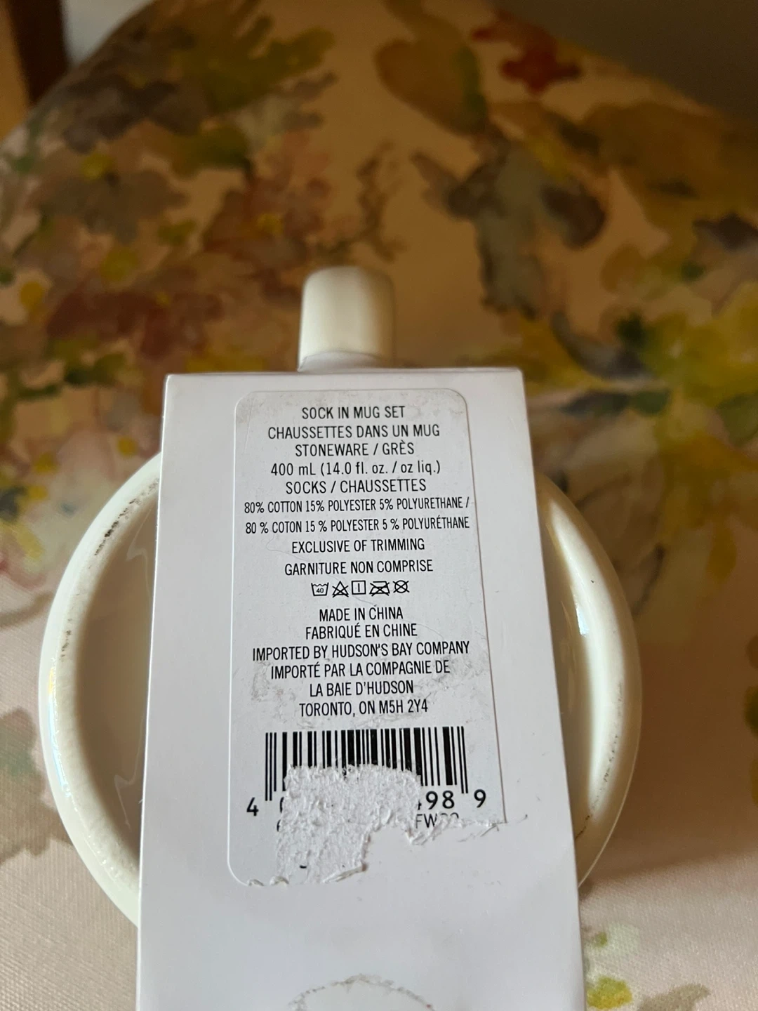 This is a sock and mug set by HBC, featuring a classic stripes design. The mug is made of stoneware and holds 400 ml (14.0 fl. oz.). The socks are a blend of 80% cotton, 15% polyester, and 5% polyurethane.