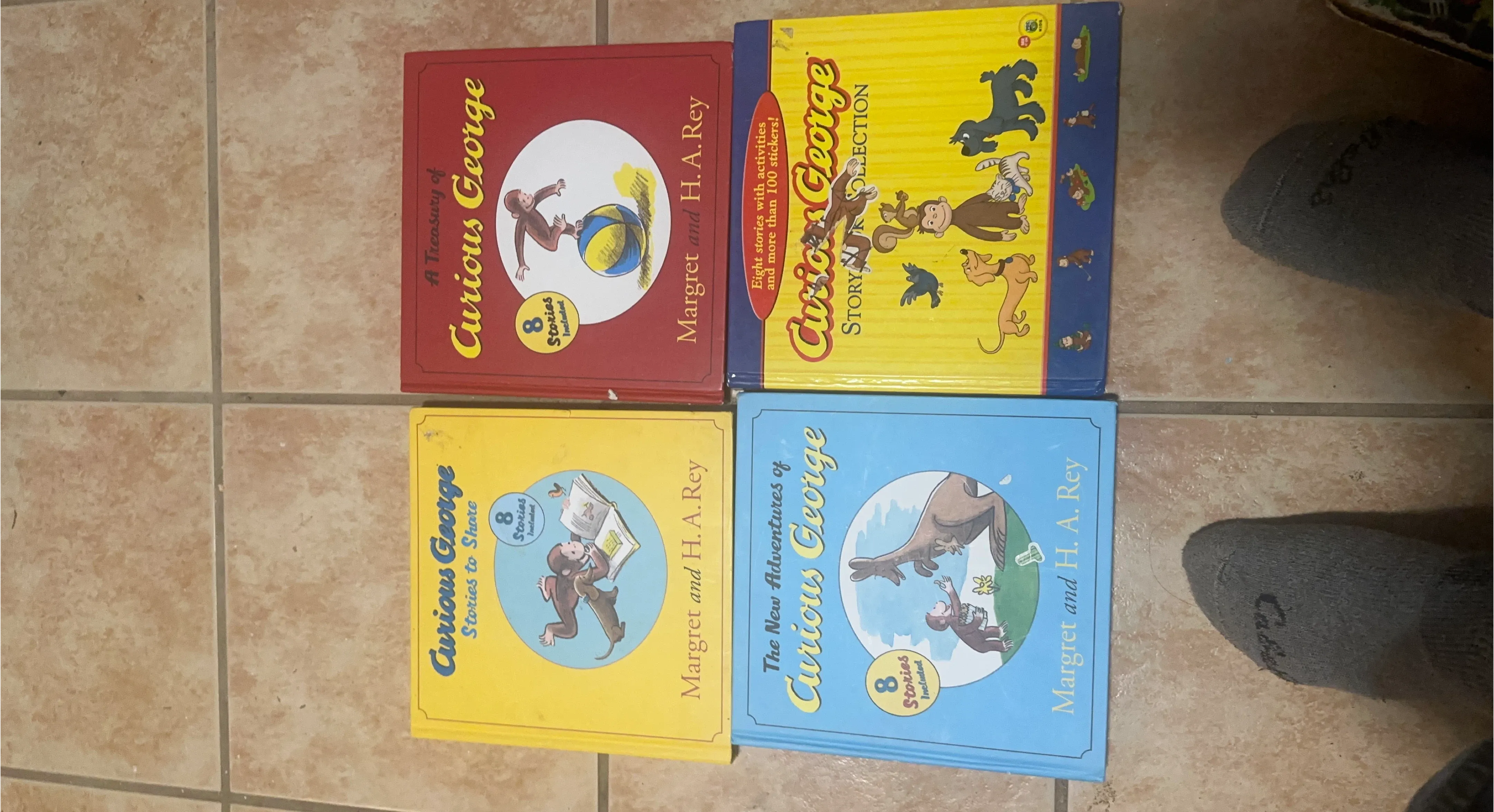 This lot includes two Curious George story collections. One is titled "A Treasury of Curious George" and includes 8 stories. The other is the "Curious George Story Collection" which has eight stories and over 100 stickers. Both are by Margret and H. A. Rey.