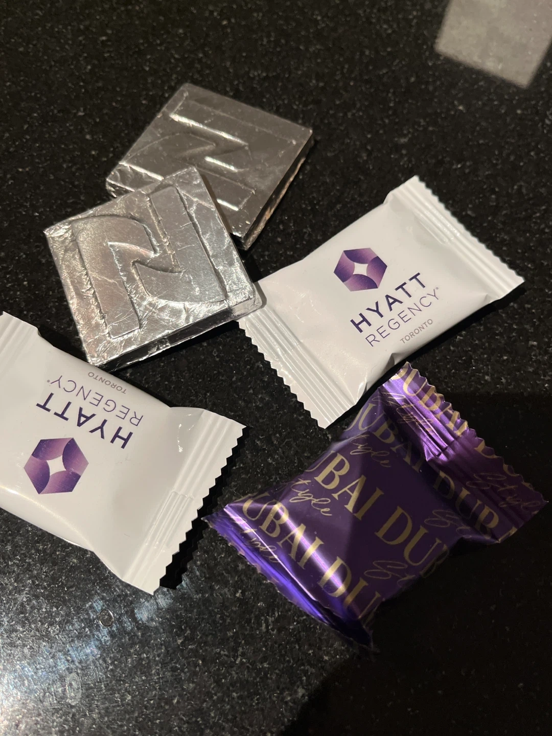 Two individually wrapped chocolates from Hyatt Regency Toronto. One foil-wrapped chocolate with a large 'R' logo. Additional purple-wrapped chocolate with 'Dubai Style' branding. These are small confections, likely served as amenities.