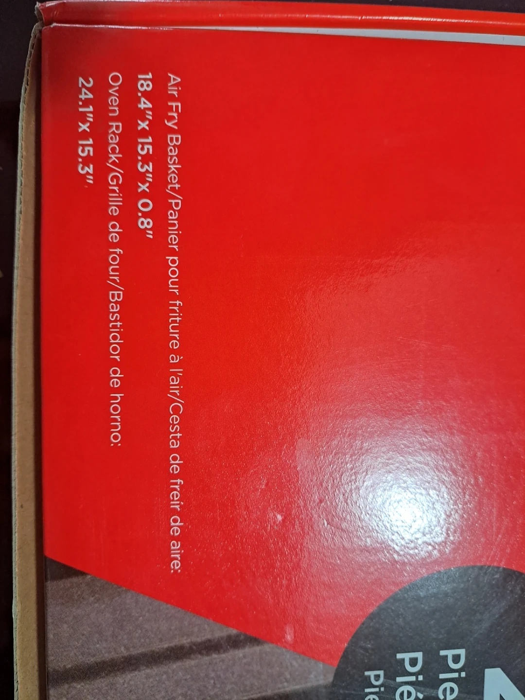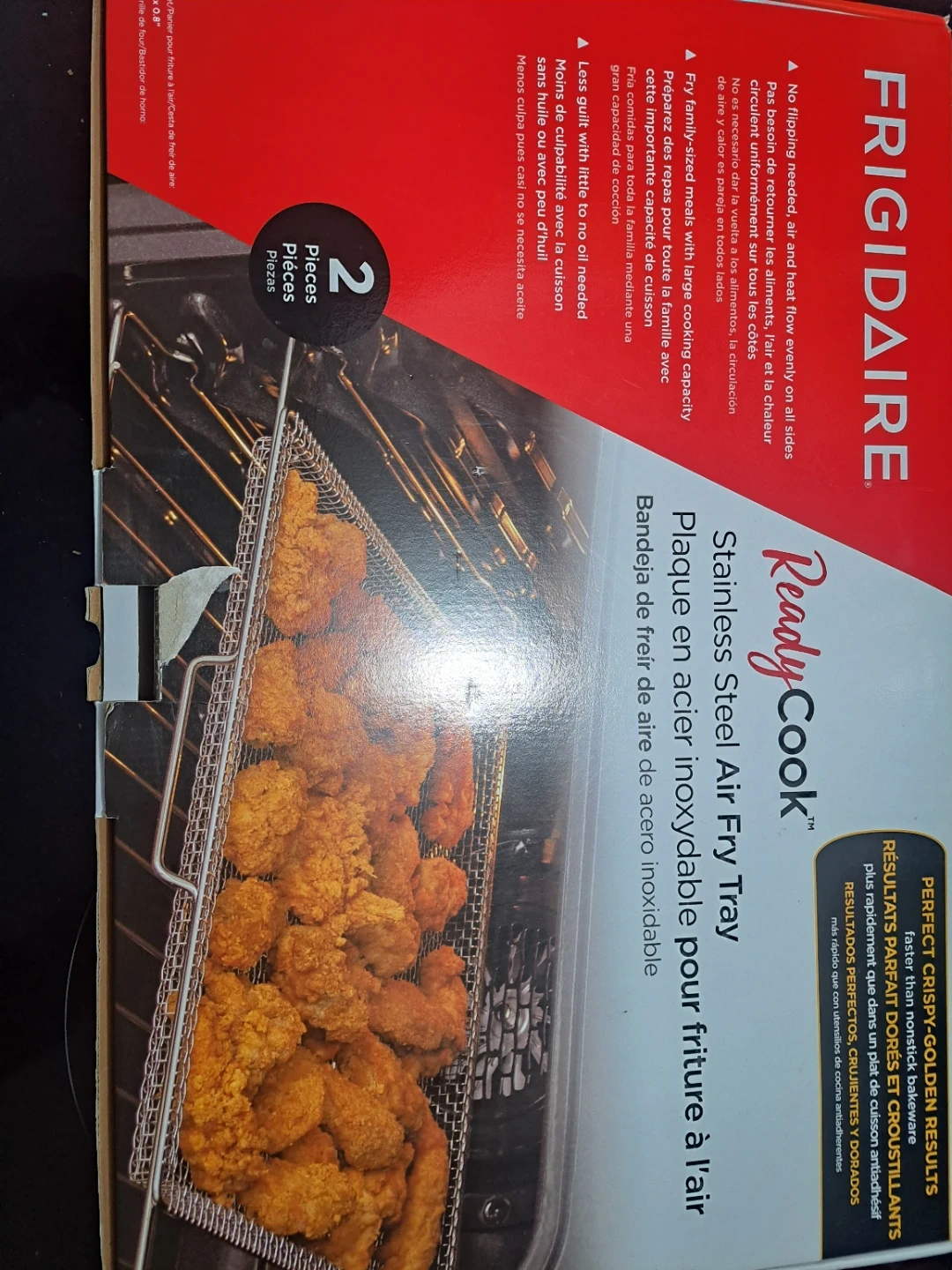 Frigidaire Ready Cook Stainless Steel Air Fry Tray. Includes oven rack and air fry basket. Dimensions are 24.1" x 15.3" x 0.8" and 18.4" x 15.3" x 0.8".