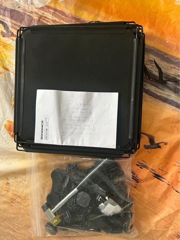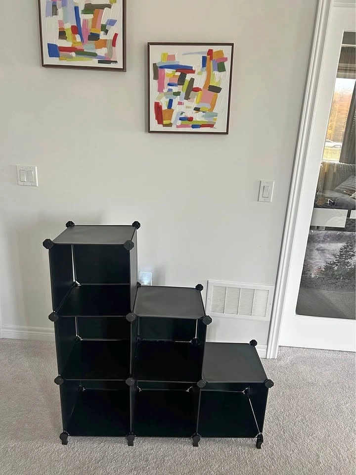 This brand new Songmics black cube storage shelf is a versatile and modern storage solution, featuring a unique staircase design with six individual cubes. Perfect for organizing books, toys, or decor in any room. Brand: Songmics, Colour: Black, Shape: Cube, Number of Shelves: 6. Let me know if you're interested!