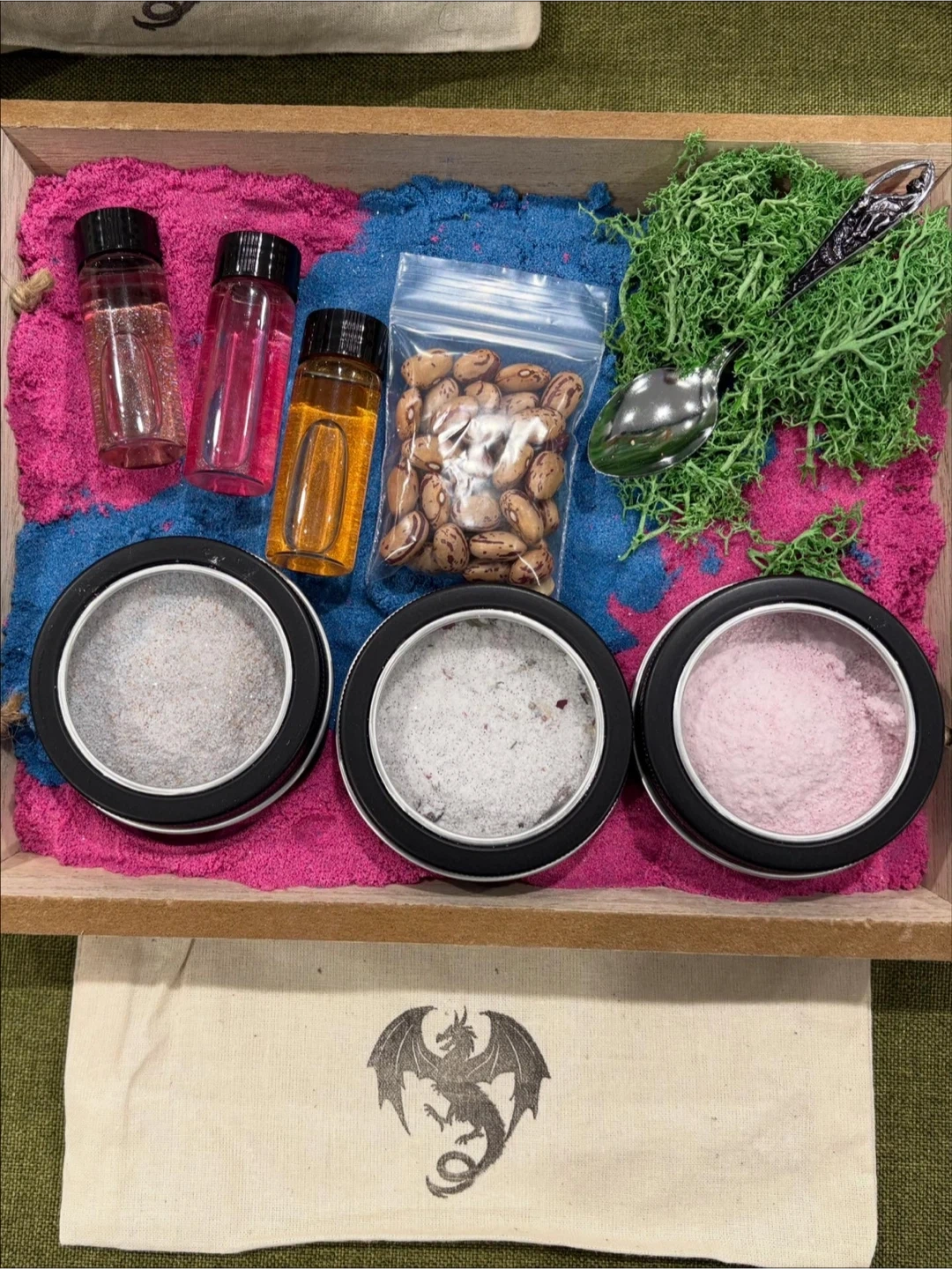 Amazing little kits for your little one to explore and learn! These kits include 3 potion powders, 3 potion water concentrates and other goodies. All ingredients are taste safe and biodegradable (yes, even the glitter!) so can be used even by the littlest sorcerers! Safe for play outside or inside, each kit has enough for quite a few batches of potion play. Simply mix some potion powder in a container of choice and pour some shimmery magical water on and watch the bubbly magic happen! Three kits are available for purchase: