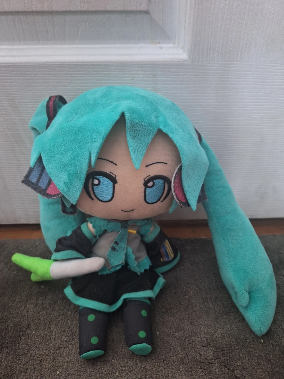This is a Hatsune Miku plush doll. It features her signature teal hair and outfit. It comes with a leek accessory. This plush is great for any Vocaloid fan!
