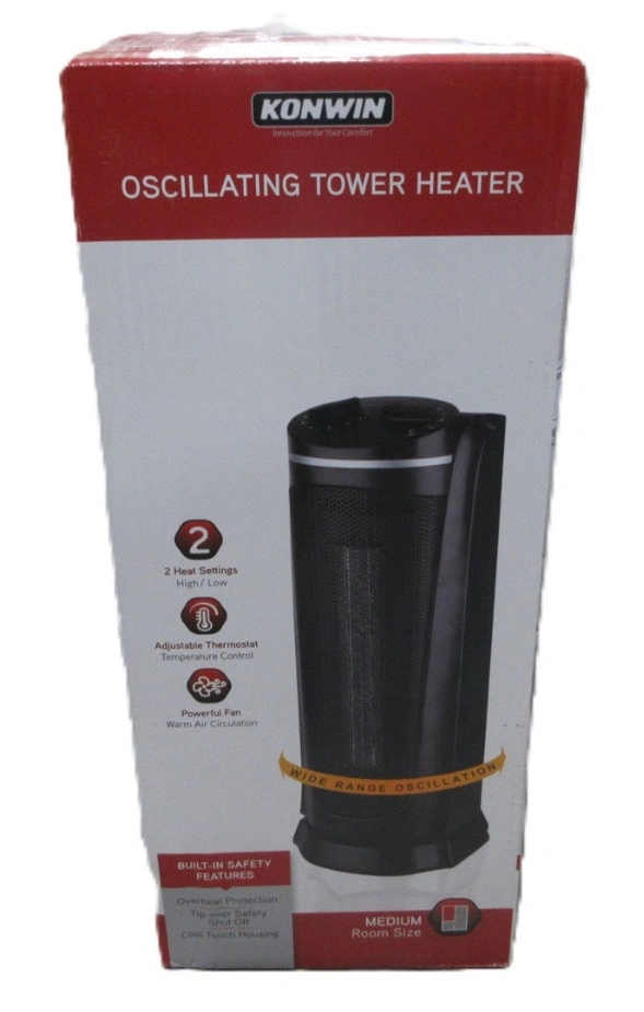 New Konwin Oscillating Tower Heater, perfect for warming medium-sized rooms. Features two heat settings (High/Low) and an adjustable thermostat. Includes safety features like overheat protection, a tip-over switch, and cool-touch housing. Cash and cashless payments accepted.