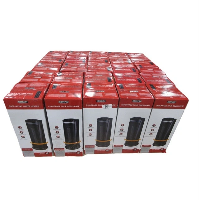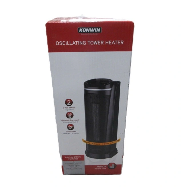 New Konwin Oscillating Tower Heater, perfect for warming medium-sized rooms. Features two heat settings (High/Low) and an adjustable thermostat. Includes safety features like overheat protection, a tip-over switch, and cool-touch housing. Cash and cashless payments accepted.