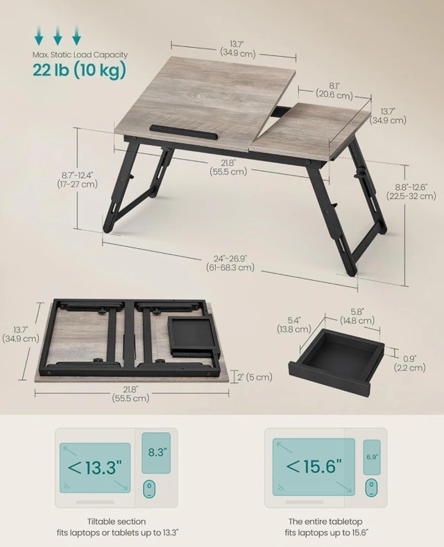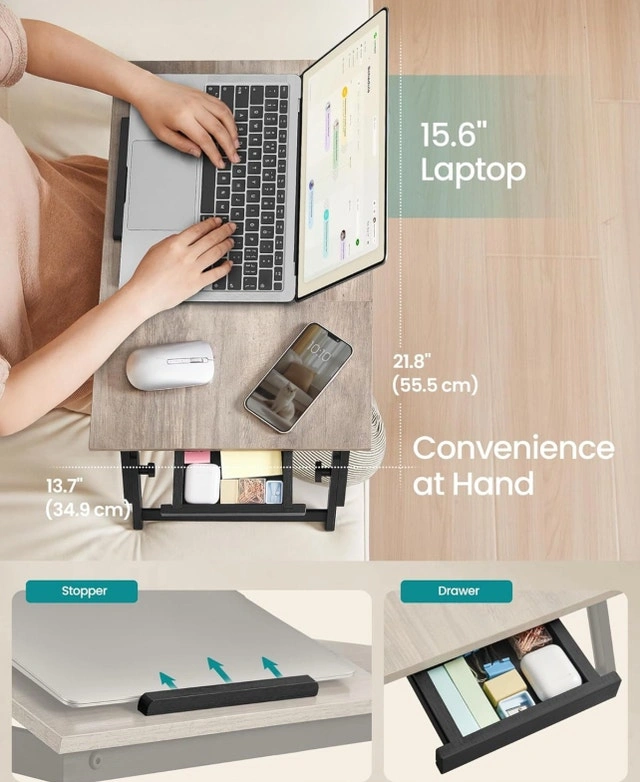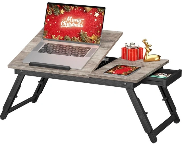 This brand-new, grey wood laptop desk is perfect for working comfortably from your bed or couch, featuring adjustable height and angle for optimal viewing! The desk can accommodate laptops up to 15.6 inches and even includes a small drawer for storage. Specifications: Adjustable Height (3 options), Adjustable Angle (6 options), Max static load capacity: 22 lbs (10 kg). Fits laptops or tablets up to 13.3 inches on the tilting section, and up to 15.6 inches on the entire tabletop. Selling for $40 CAD. If the ad is still up, yes, it's available!