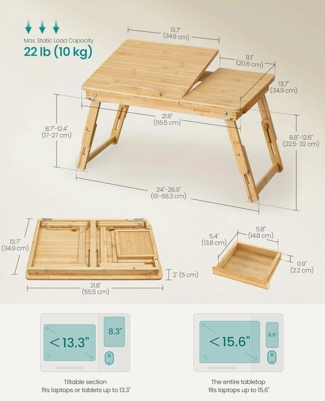 This brand new laptop bed desk is perfect for working or relaxing in bed, on the couch, or anywhere you need a convenient surface! It features a tilting top, a small drawer for storage, and foldable legs for easy storage. Its crafted from bamboo for a natural look. Adjustable Height: Yes, Material: Bamboo, Features: Tilting Top, Storage Drawer, Foldable Legs. If the ad is up, it's still available! Cash accepted.