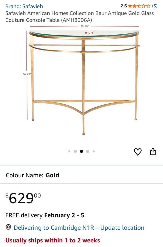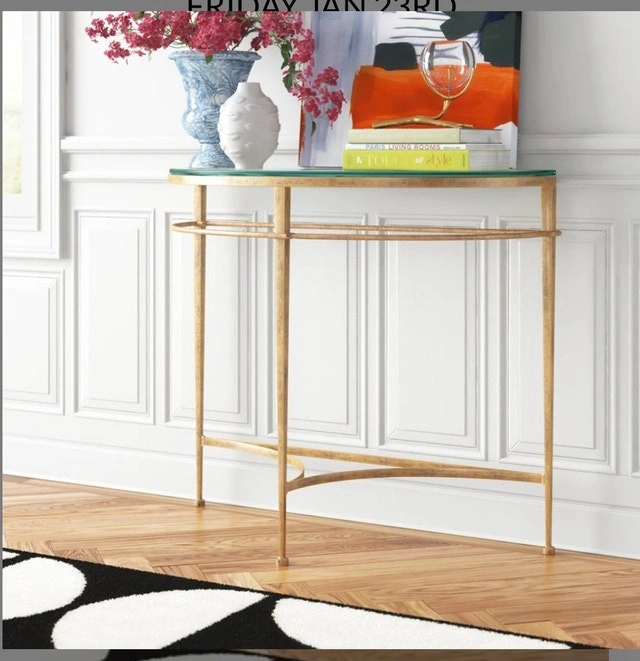 Enhance your living space with this new Safavieh American Homes Collection Baur Couture console table, featuring an antique gold finish and elegant glass top. Dimensions: 35.75" W x 15.375" D x 30.875" H. Never used and still in original packaging! Brand: Safavieh, Collection: American Homes Collection, Style: Couture, Finish: Antique Gold, Top Material: Glass. Let me know if you're interested!