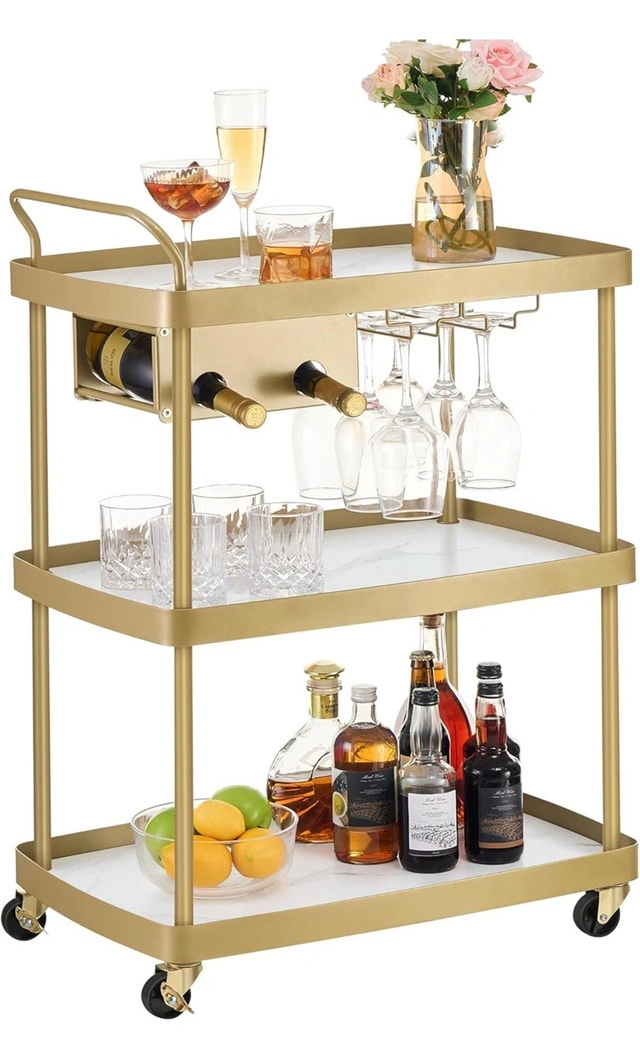 This brand new SONGMICS HOME bar cart is perfect for entertaining! It features three tiers, offering ample space for bottles, glasses, and accessories. The gold finish and marble-look shelves add a touch of elegance to any room. Whether you're serving cocktails or displaying decor, this cart is both stylish and functional.