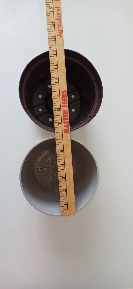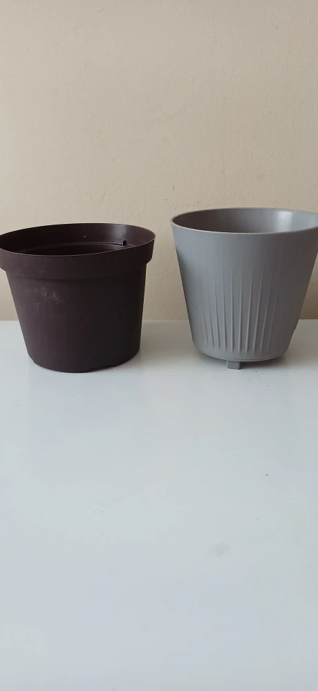 This is a set of two plastic plant pots, one brown and one grey. The brown pot measures approximately 6 inches tall and 7 inches in diameter at the top. The grey pot measures approximately 5.5 inches tall and 6 inches in diameter at the top. They're suitable for small to medium-sized plants.