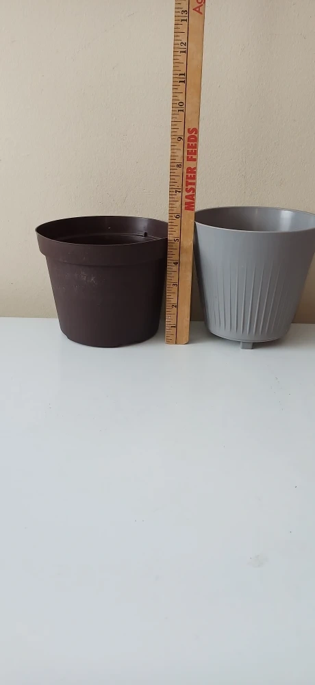 This is a set of two plastic plant pots, one brown and one grey. The brown pot measures approximately 6 inches tall and 7 inches in diameter at the top. The grey pot measures approximately 5.5 inches tall and 6 inches in diameter at the top. They're suitable for small to medium-sized plants.
