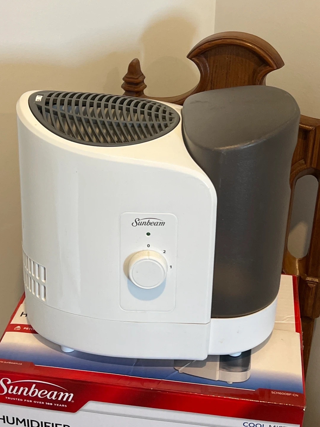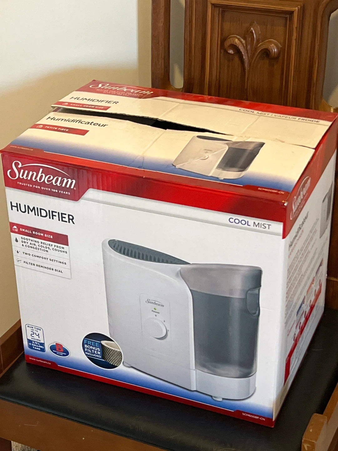 This Sunbeam cool mist humidifier is designed for small rooms. It features a filter reminder dial and offers soothing relief from dry air, colds, and congestion. Run time is 24 hours per tank. You will need a new filter.