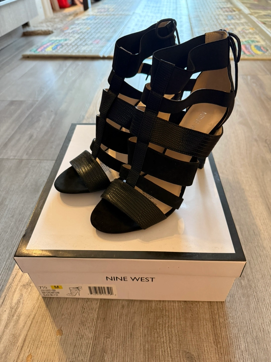 These Nine West heels feature a black strappy design with textured accents. They come in a size 7.5M. The original box is included. Only worn these inside the house. Pick up by the Eaton Center. $5 brand new