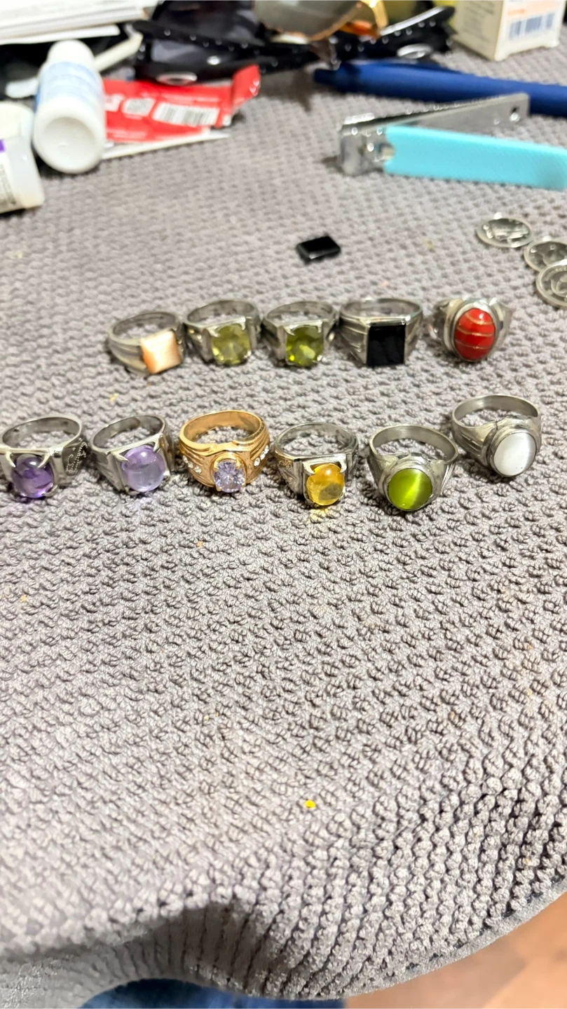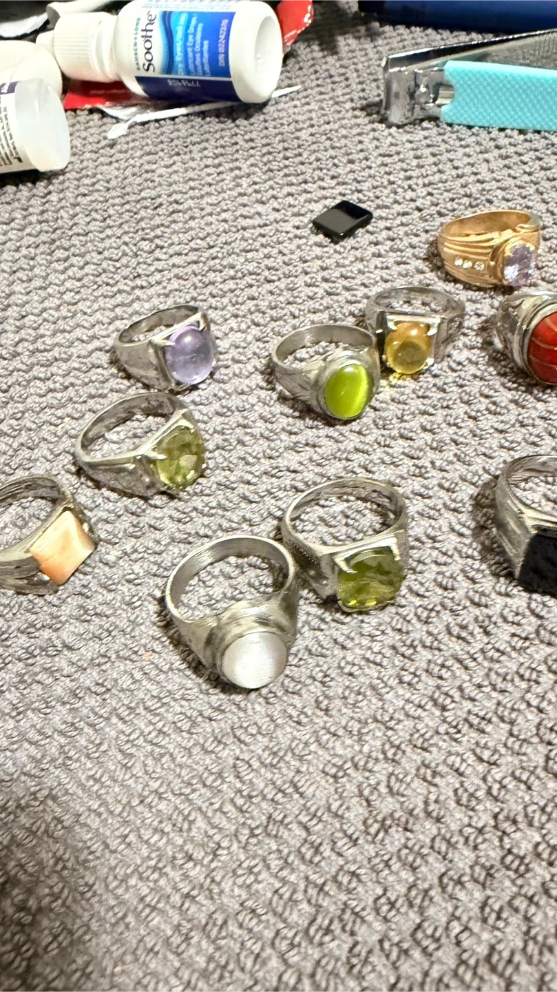 A collection of assorted rings featuring various gemstones. Includes pieces with amethyst, peridot, moonstone, onyx, and a unique red banded stone. These rings offer a variety of styles for everyday wear or special occasions. The size is medium/ small adult. Open for offers