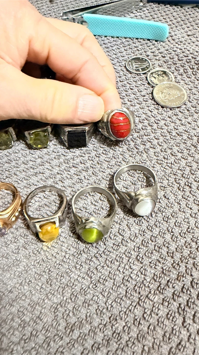 A collection of assorted rings featuring various gemstones. Includes pieces with amethyst, peridot, moonstone, onyx, and a unique red banded stone. These rings offer a variety of styles for everyday wear or special occasions. The size is medium/ small adult. Open for offers