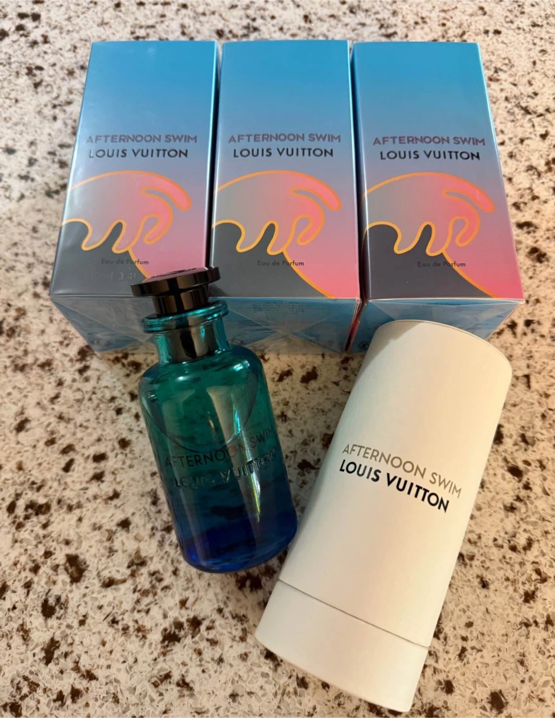 Three bottles of Louis Vuitton Afternoon Swim Eau de Parfum. Each bottle contains 3.4 fl oz. This fragrance is perfect for warm weather.