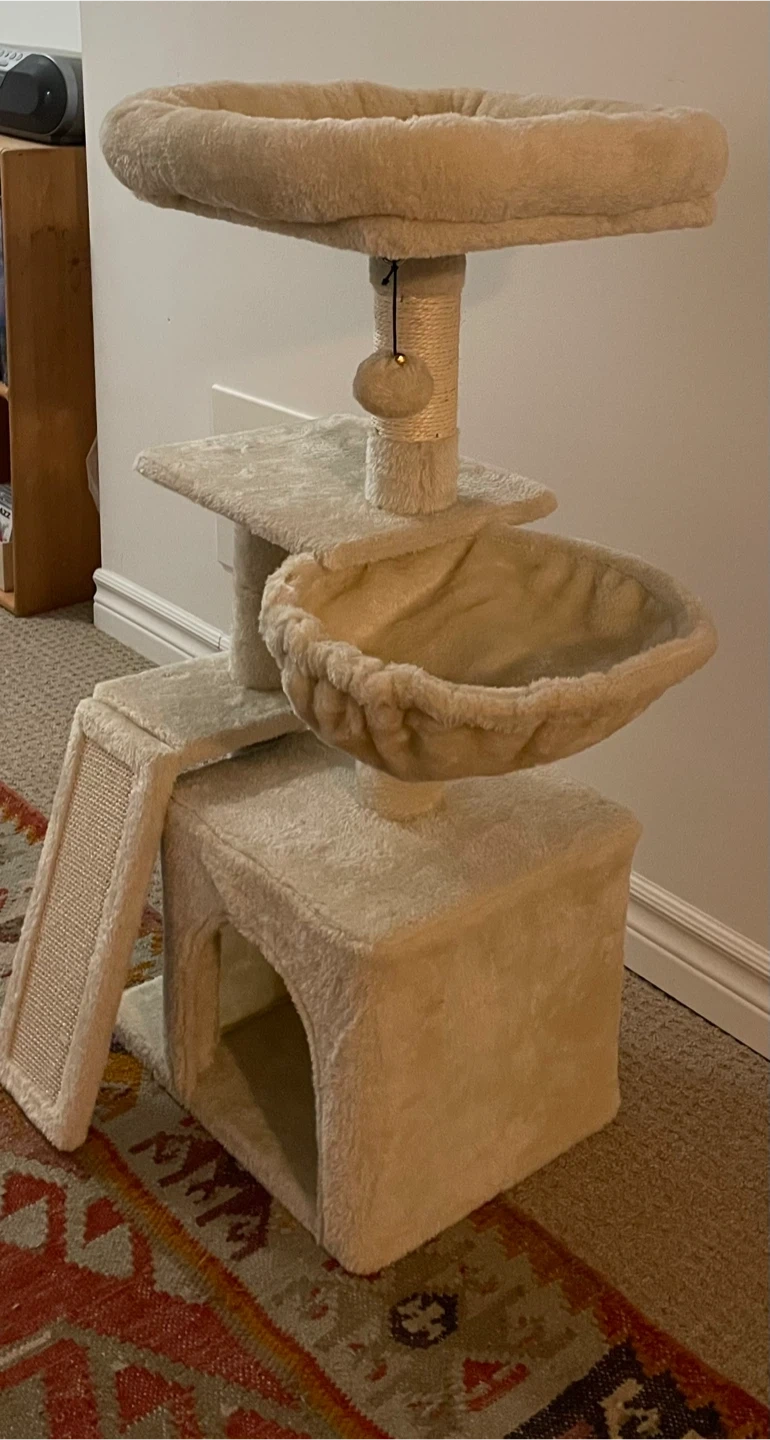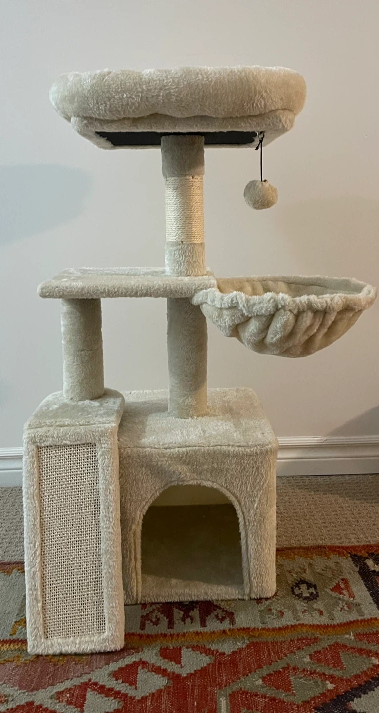 Cream coloured cat tree condo offering multiple levels for lounging and playing. It includes a hammock, a sisal scratching pad on the side, and a cozy hideaway cave at the base. Cats will love climbing and exploring this sturdy structure!