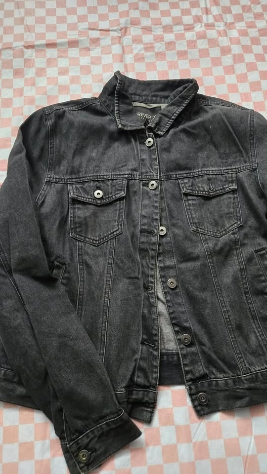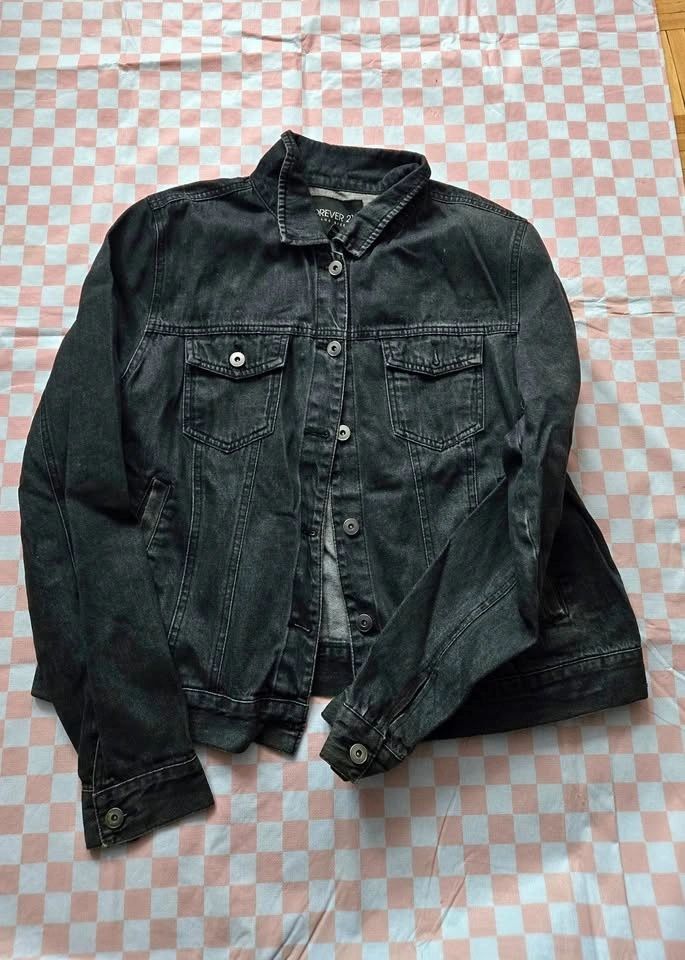 Forever 21 Plus black wash jean jacket, size 2X / UK 22. Very light and thin, perfect for spring, summer, or early fall. It used to have enamel pins on it, so there's some light damage shown in the last picture, but it's not really noticeable. Features a 6-button closure. Bust measures 23", hip measures 22", and sleeves from shoulder to wrist are 26". Pick up near Queen and John.