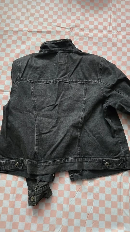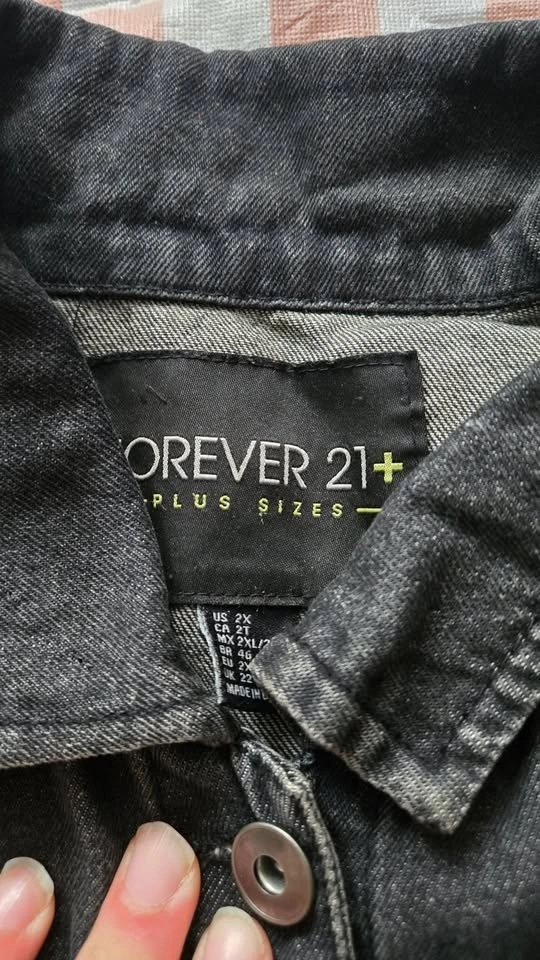 Forever 21 Plus black wash jean jacket, size 2X / UK 22. Very light and thin, perfect for spring, summer, or early fall. It used to have enamel pins on it, so there's some light damage shown in the last picture, but it's not really noticeable. Features a 6-button closure. Bust measures 23", hip measures 22", and sleeves from shoulder to wrist are 26". Pick up near Queen and John.