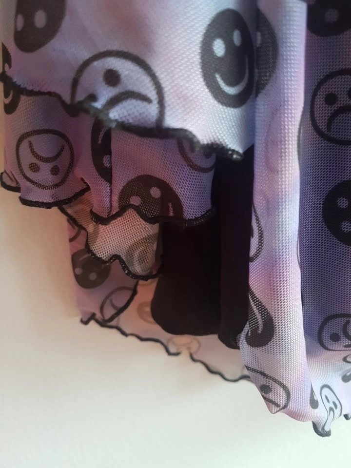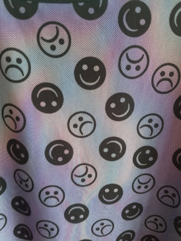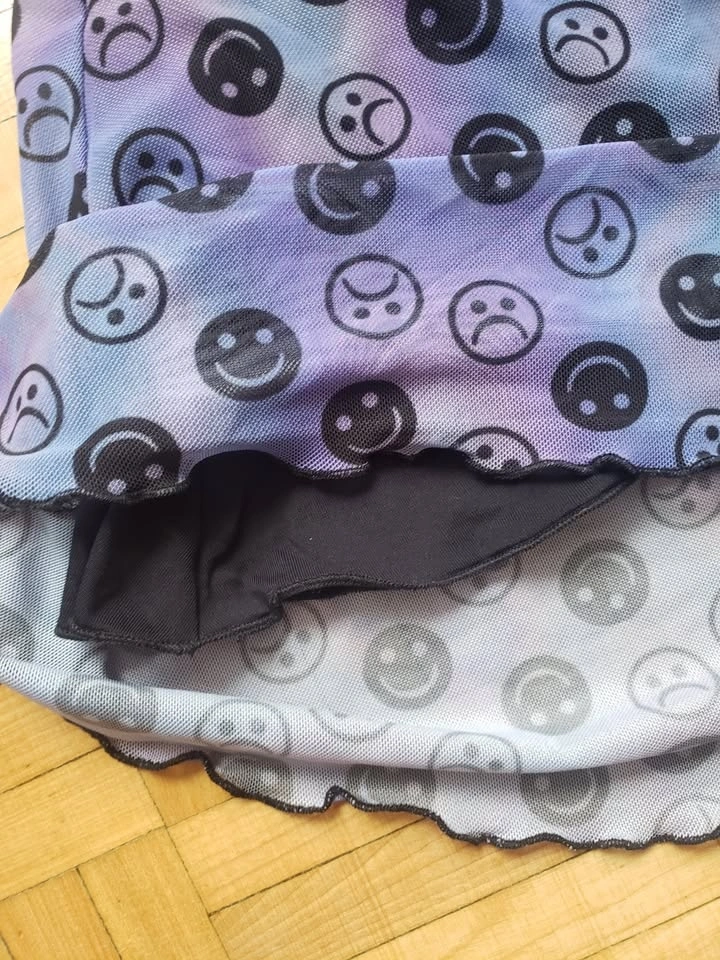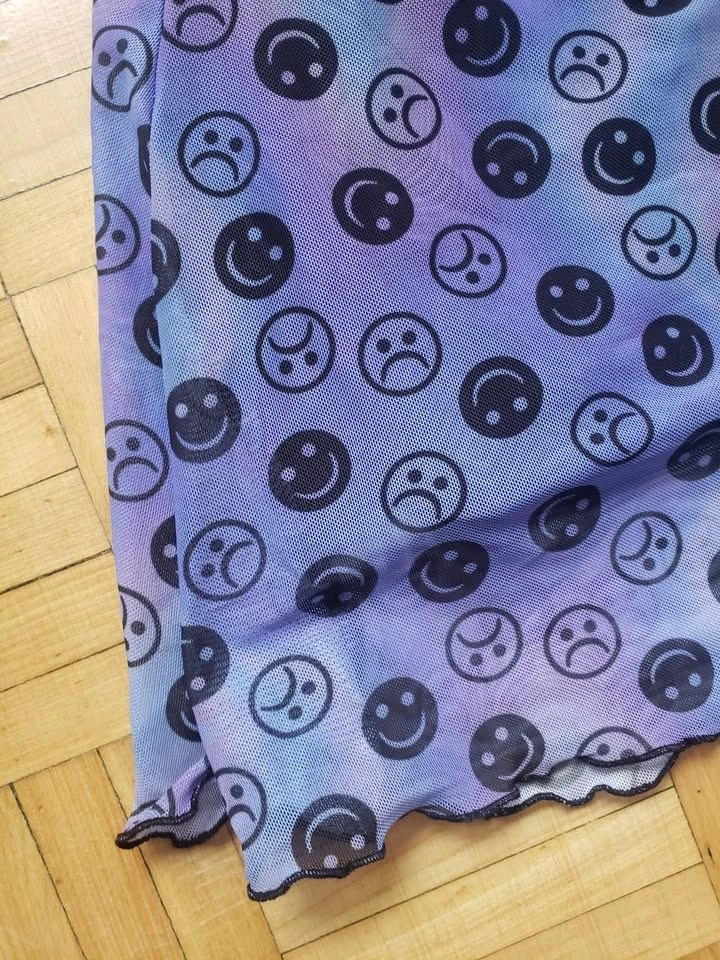 Tie-dye blue, purple, and aqua slip dress with smiley and frown faces printed. Features a mesh black lining underneath and adjustable straps. Size 3X. New, never worn, no tags. Length: 26", width: 21". Pick up at Queen and John.