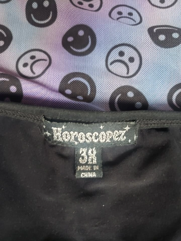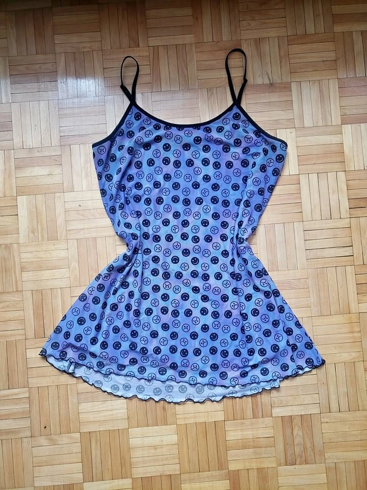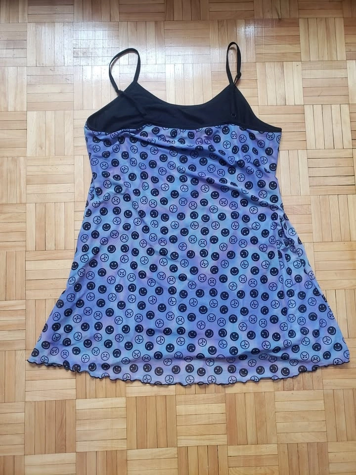 Tie-dye blue, purple, and aqua slip dress with smiley and frown faces printed. Features a mesh black lining underneath and adjustable straps. Size 3X. New, never worn, no tags. Length: 26", width: 21". Pick up at Queen and John.