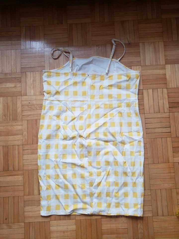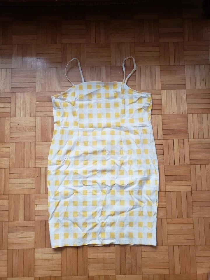 Cute Yellow Gingham, buffalo check plaid printed mini dress. Very stretchy, bodycon summer dress Size US 2XL. Adjustable straps, with zipper and hook and eye closure on back. Measurements: Length (top of bust to hem) 30", Bust 18", Hips 20". Pick up Queen and John.