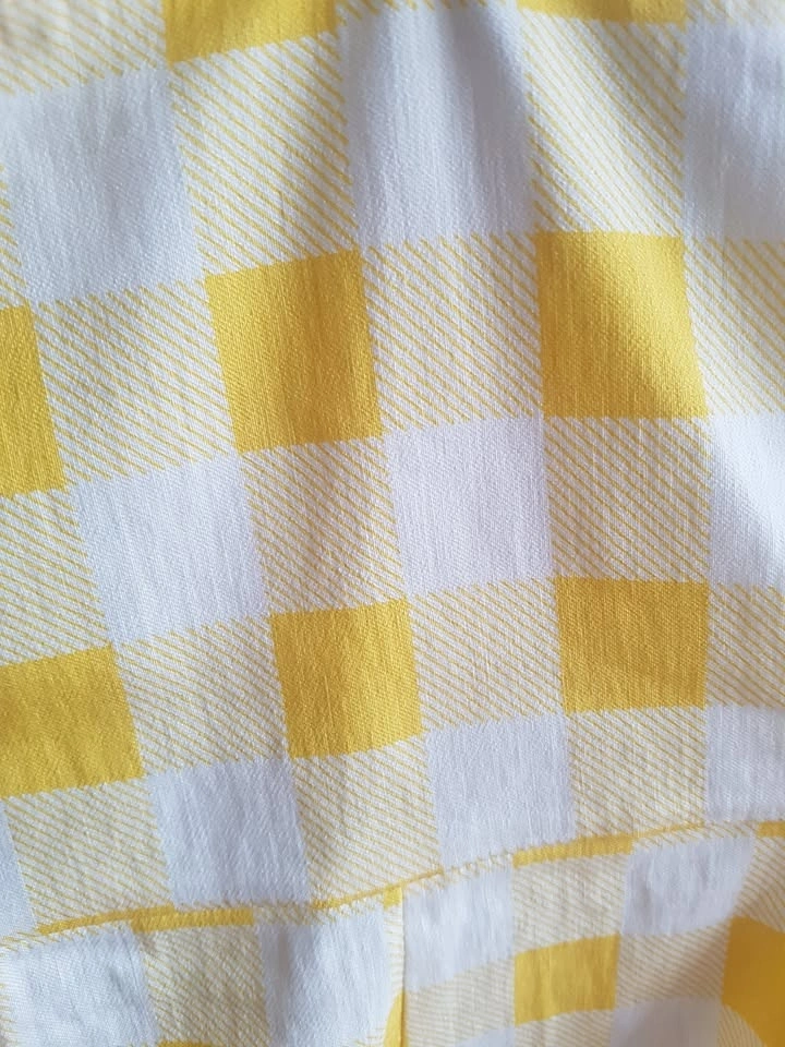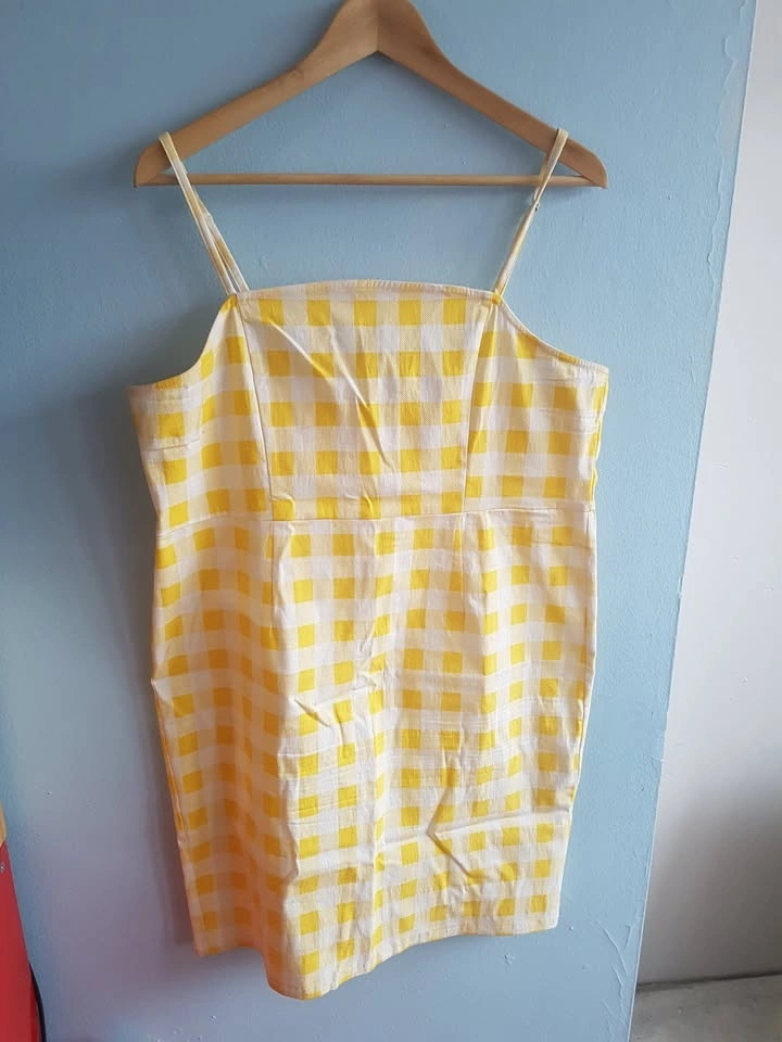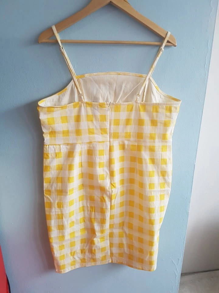 Cute Yellow Gingham, buffalo check plaid printed mini dress. Very stretchy, bodycon summer dress Size US 2XL. Adjustable straps, with zipper and hook and eye closure on back. Measurements: Length (top of bust to hem) 30", Bust 18", Hips 20". Pick up Queen and John.