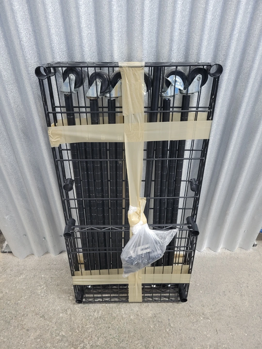 This black metal wire garment rack features a sturdy construction with multiple shelves for storage and a hanging rod for clothes. It's on wheels for easy mobility. Assembly hardware is included.