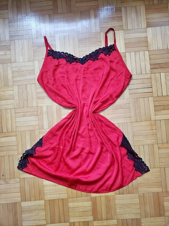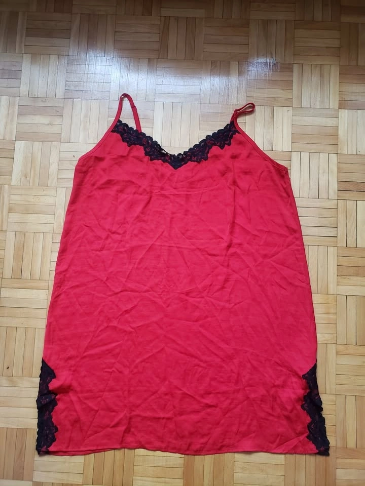 Forever 21 red slip dress with black lace trim on neckline and side slits. Small slits on both sides, brand new with no tags. Size US 2XL/UK 22. Measurements: 28" from neckline to bottom hem, 50" across bust, hip, waist, and bottom hem. Pick up near Queen and John.