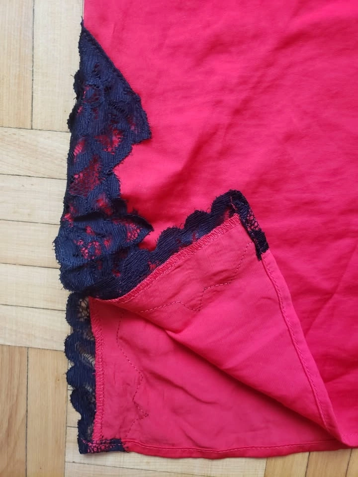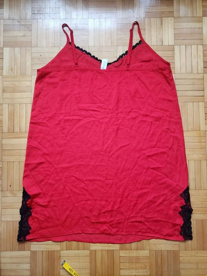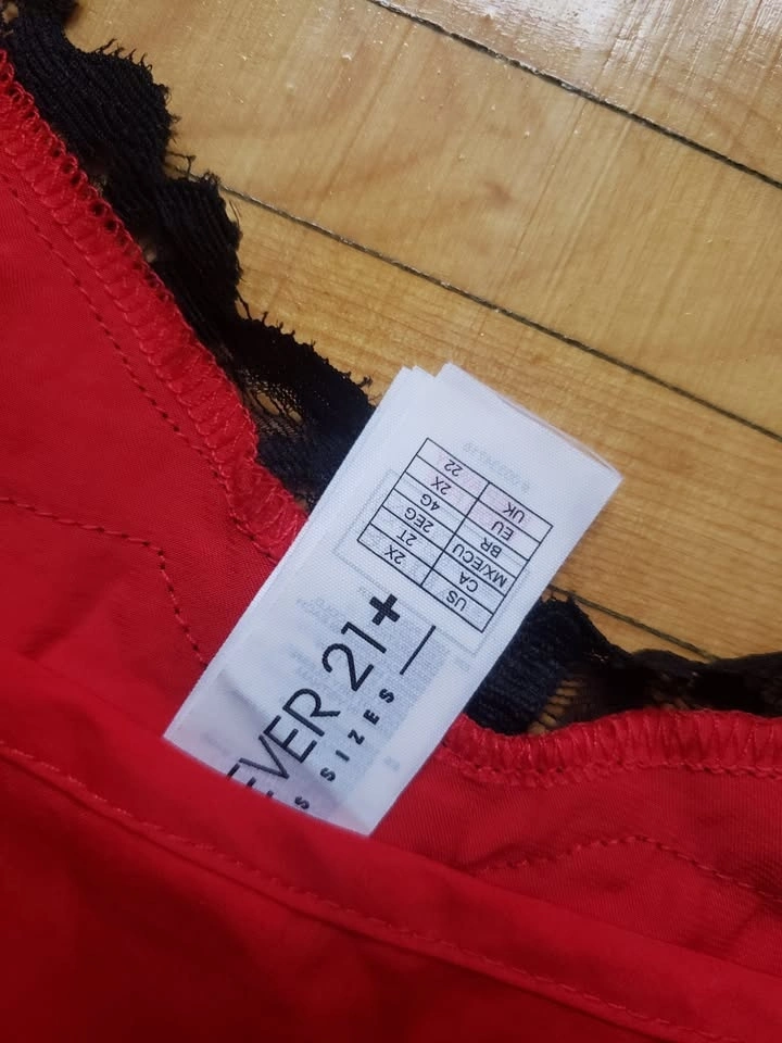 Forever 21 red slip dress with black lace trim on neckline and side slits. Small slits on both sides, brand new with no tags. Size US 2XL/UK 22. Measurements: 28" from neckline to bottom hem, 50" across bust, hip, waist, and bottom hem. Pick up near Queen and John.