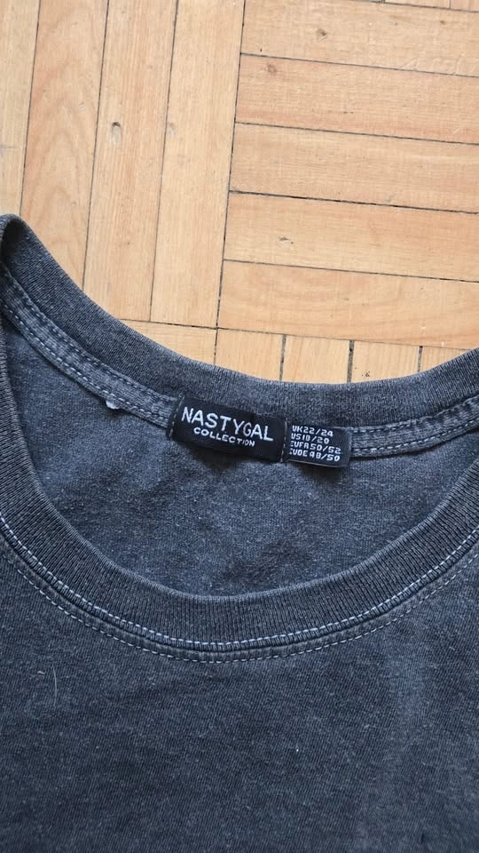 Nasty Gal collection t-shirt with a "Till Death" graphic on the back, featuring a skeleton hand holding a rose. The fabric is grey with a vintage wash and the graphic has vintage distressing. Size US 18, armpit to armpit is 26" and length is 27". Pick up near Queen and John.