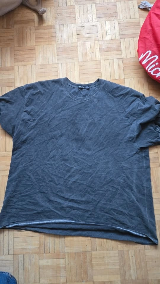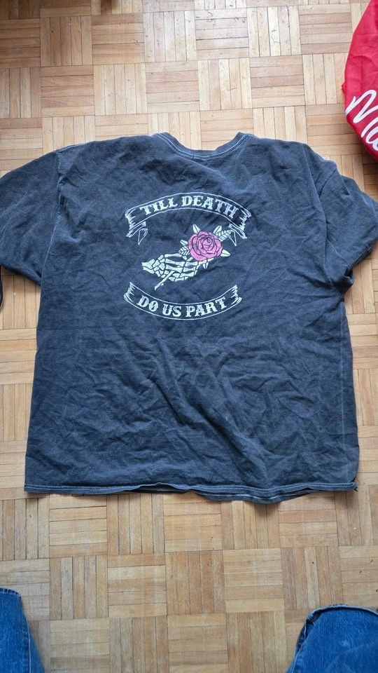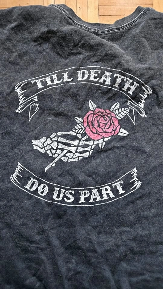 Nasty Gal collection t-shirt with a "Till Death" graphic on the back, featuring a skeleton hand holding a rose. The fabric is grey with a vintage wash and the graphic has vintage distressing. Size US 18, armpit to armpit is 26" and length is 27". Pick up near Queen and John.